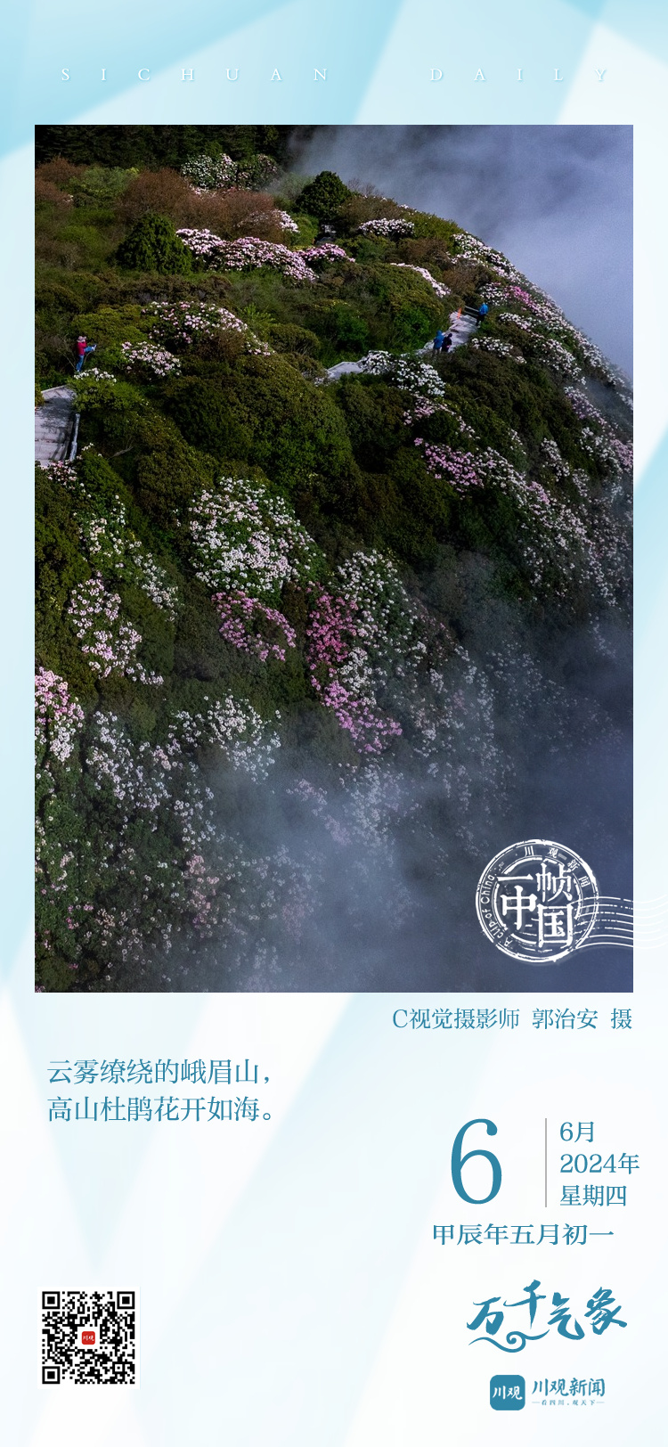 今天的《一帧中国》,川观新闻带您来到峨眉山,欣赏壮观的高山杜鹃花海。