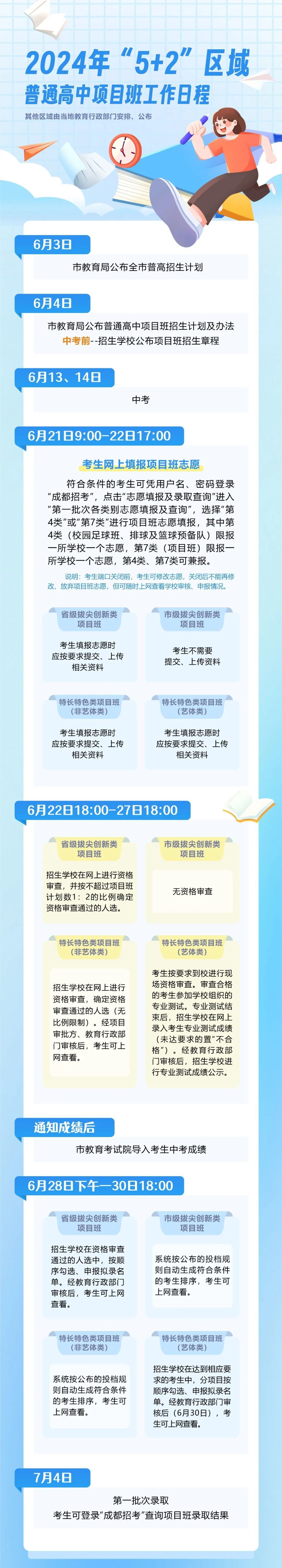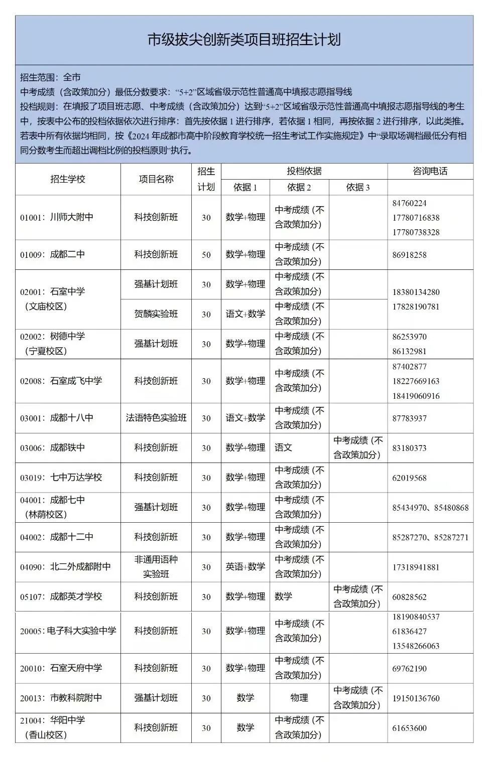 成都市拔尖创新类项目班(含语言类),由招生学校在中考学科中确定1-2门学科作为考生项目班投档学科。中考成绩发布后,市教育考试院按其投档学科总成绩从高到低依次录取(考生中考成绩须达到同批次录取分数线)。市教育局批准的特长特色类和其他类项目班按批准的规则录取。省教育厅批准的项目班按相关规定录取。