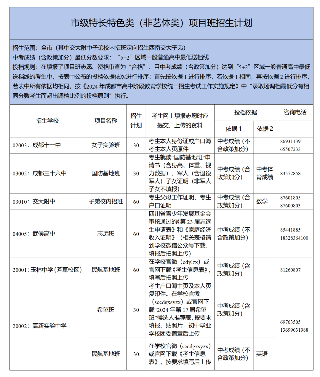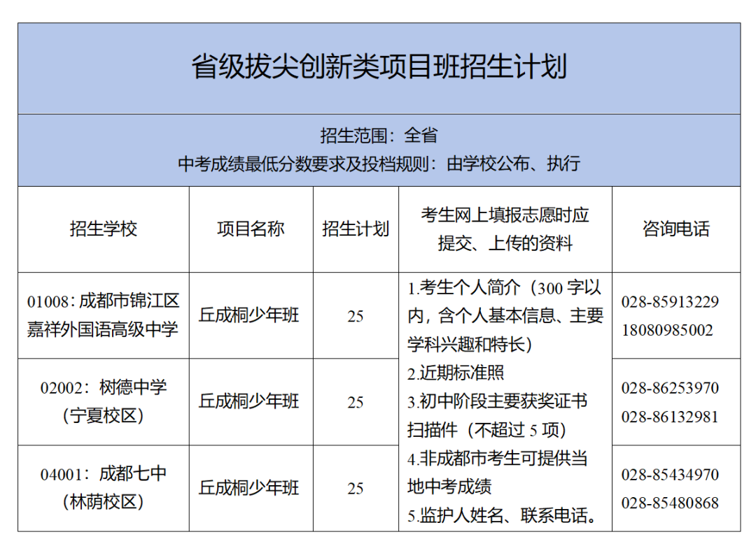 经省教育厅批准的项目班,如空军青少年航空实验班、海军青少年航空实验班、丘成桐班和民族教育班,按批准的范围招生;经成都市教育局批准的项目班,面向成都市内招生。