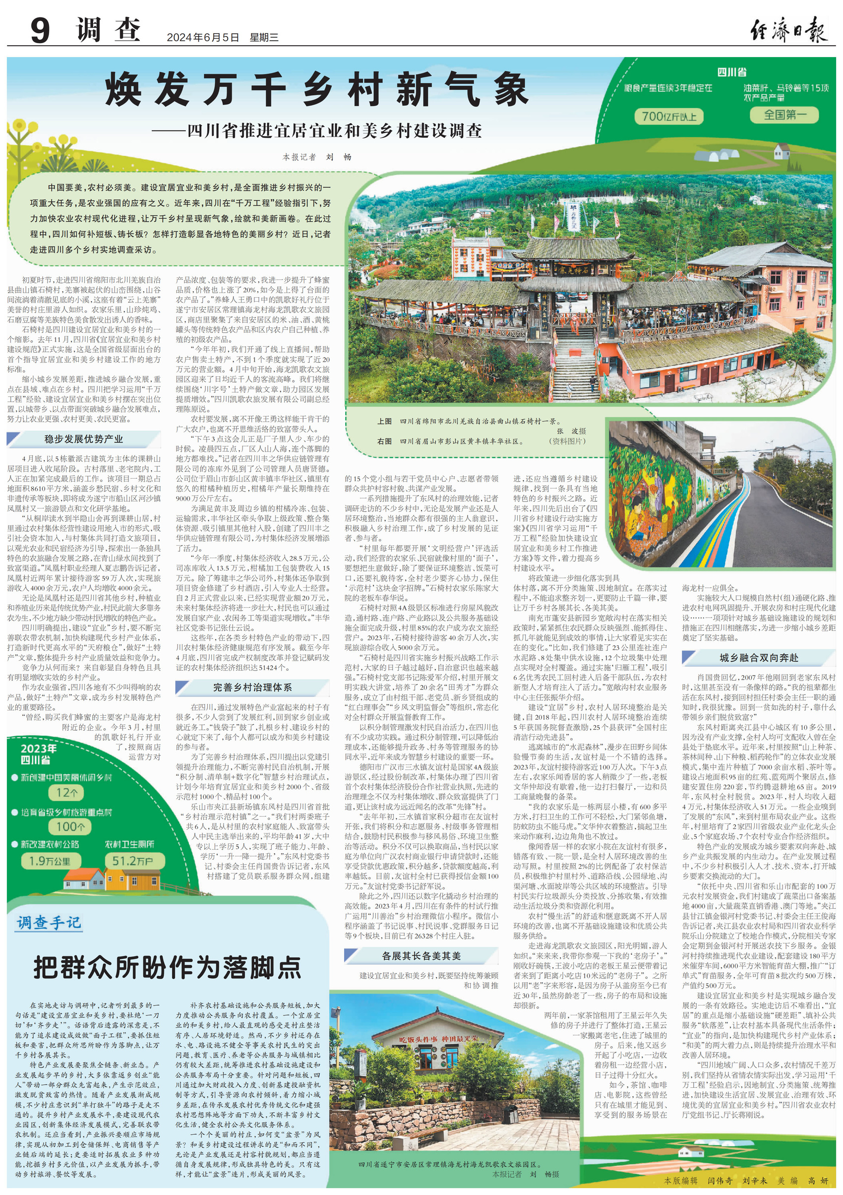 中国要美,农村必须美。建设宜居宜业和美乡村,是全面推进乡村振兴的一项重大任务,是农业强国的应有之义。近年来,四川在“千万工程”经验指引下,努力加快农业农村现代化进程,让万千乡村呈现新气象,绘就和美新画卷。在此过程中,四川如何补短板、铸长板?怎样打造彰显各地特色的美丽乡村?近日,记者走进四川多个乡村实地调查采访。
