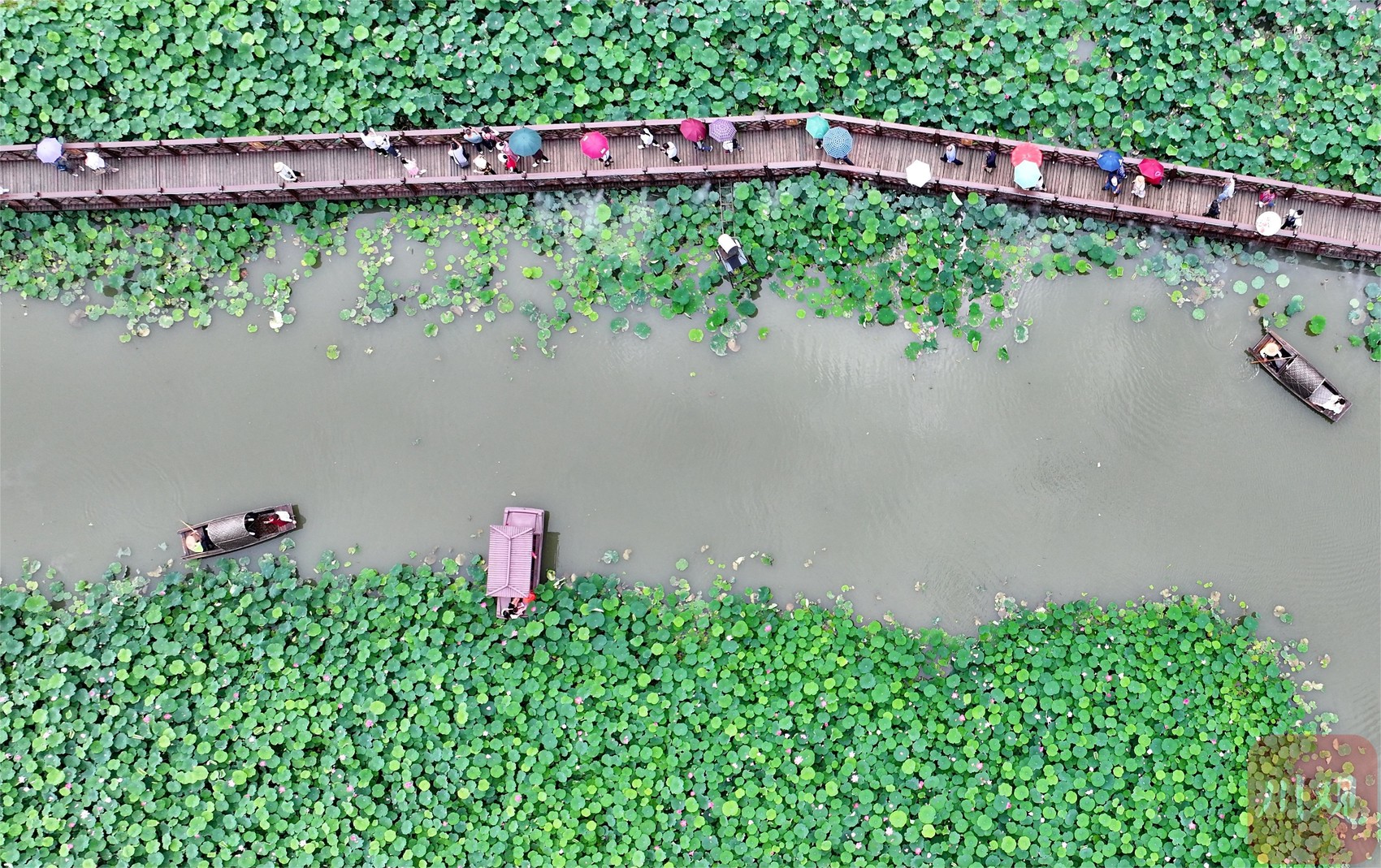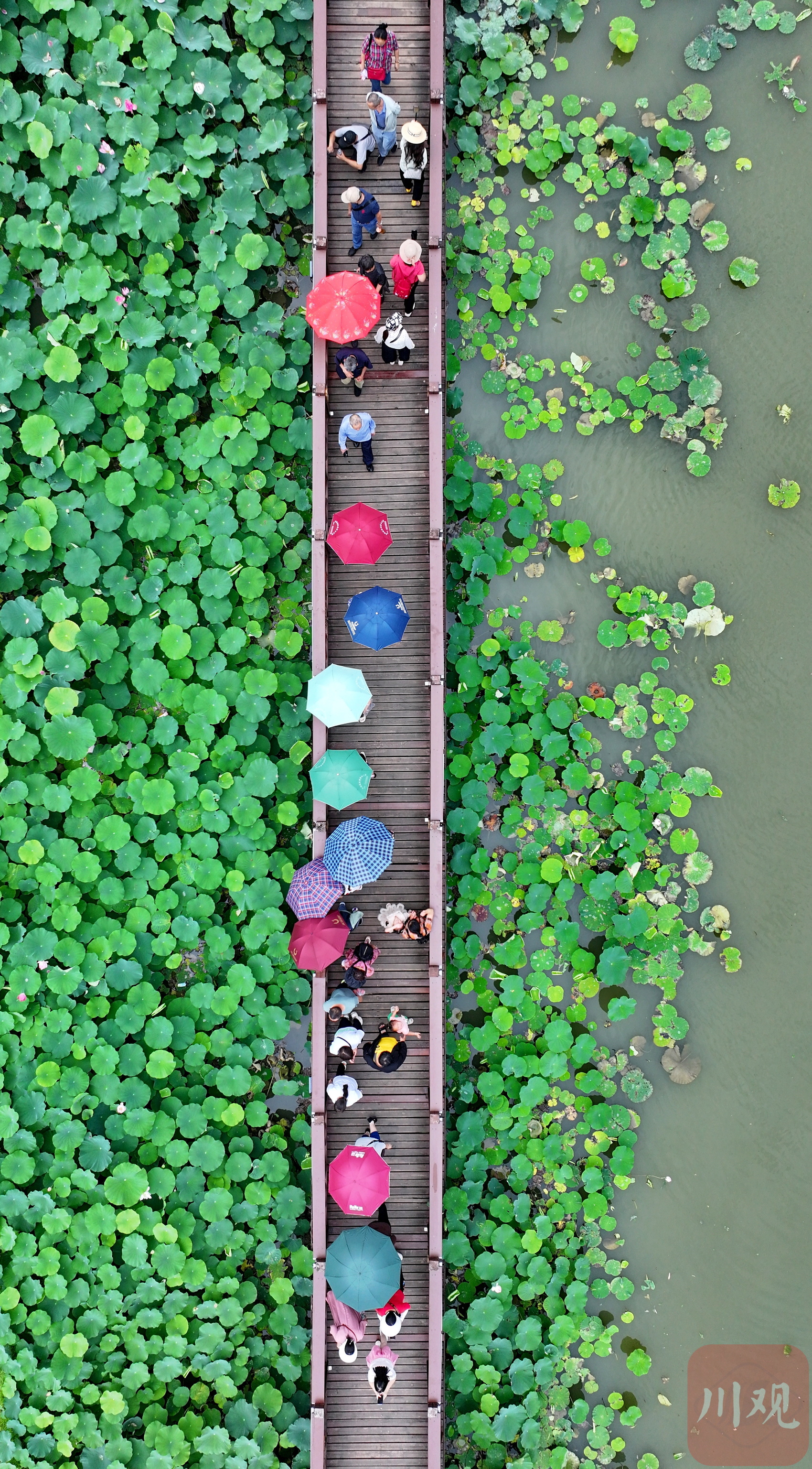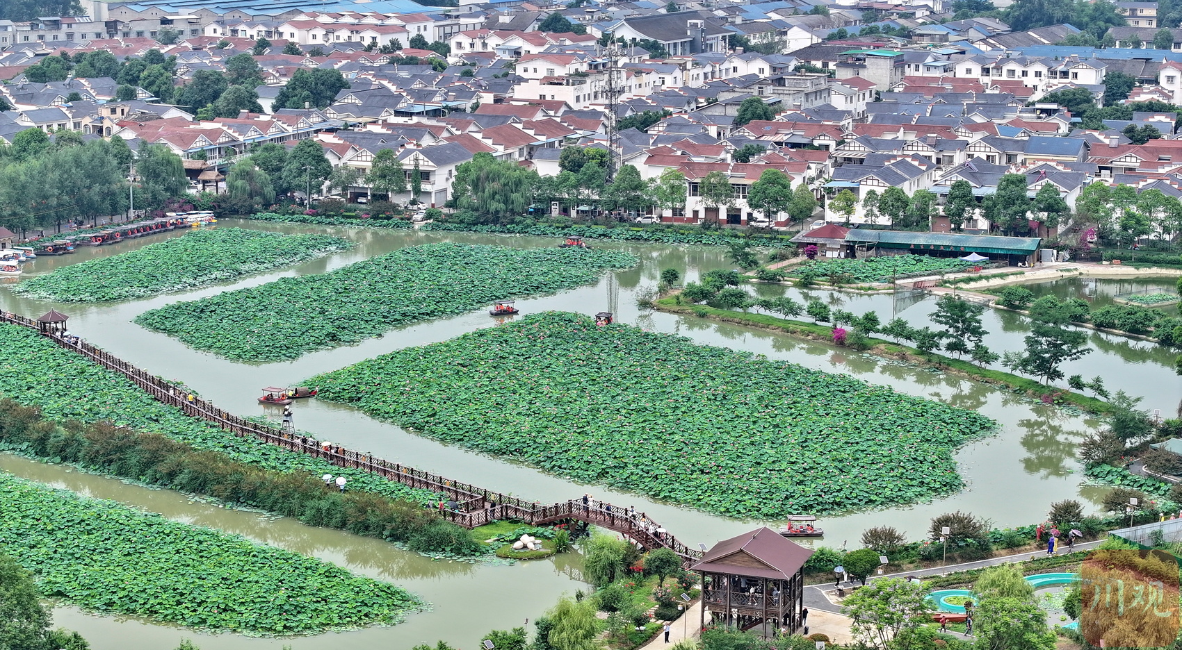 成都市新津区安西镇千亩荷塘风景如画,吸引大批游客来赏景。