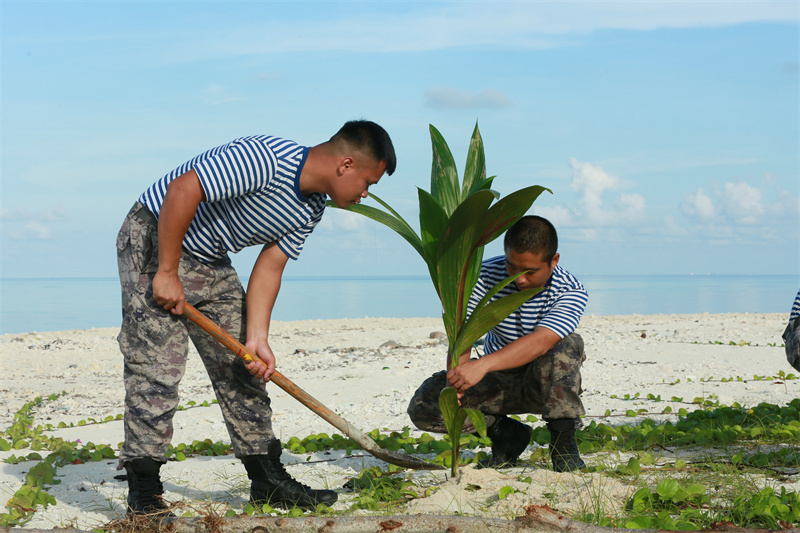 图为西沙守备部队官兵种植椰子树。通讯员 张钟鑫 摄