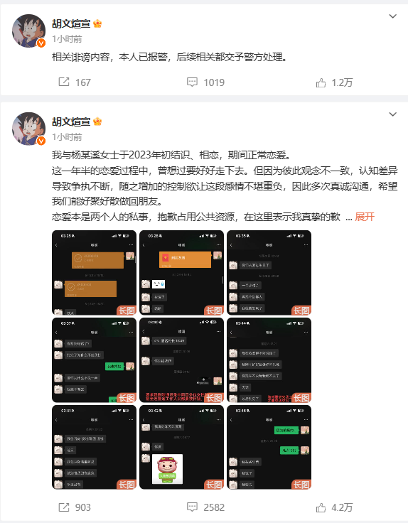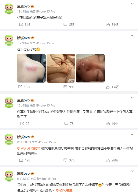 6月5日,胡文煊通过个人微博晒出聊天记录回应孕期出轨,称自己与杨某溪女士于2023年正常恋爱,后因观念不一致和不堪忍受“控制欲”,曾多次真诚沟通希望好聚好散。还称杨某溪女士找酒店私开房卡擅自进入自己的房间,还报警向警方谎称胡文煊自杀以此来联系他的方式。
