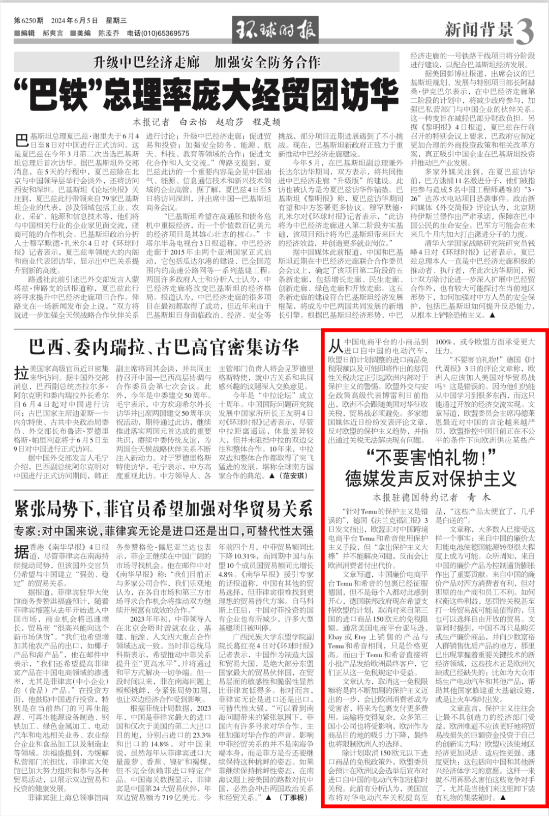 从中国电商平台的小商品到进口自中国的电动汽车,欧盟日前计划调整的进口商品免税限额以及可能即将作出的惩罚性关税决定正引起欧洲内部对于保护主义的警惕。欧盟外交与安全政策高级代表博雷利日前指出,欧洲不会跟随美国对华征收关税,贸易战必须避免。多家德国媒体近日纷纷发表评论文章,反对欧盟的保护主义趋势,并指出通过关税无法解决现有问题。