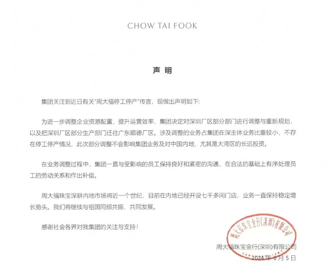 据此前网传的通知截图,因市场环境变化,基于公司发展战略调整、业务生产转型需要,公司股东已决定将北山工厂的生产制造业务进行迁移,相关生产线、设备、原材料等资产也进行转移。公司生产制造业务于2024年6月1日开始停工停产,停工停产期限及后续安排视市场环境和集团计划等情况确定,公司将另行通知。该通知落款为周大福深圳珠宝制造有限公司,时间为5月29日。