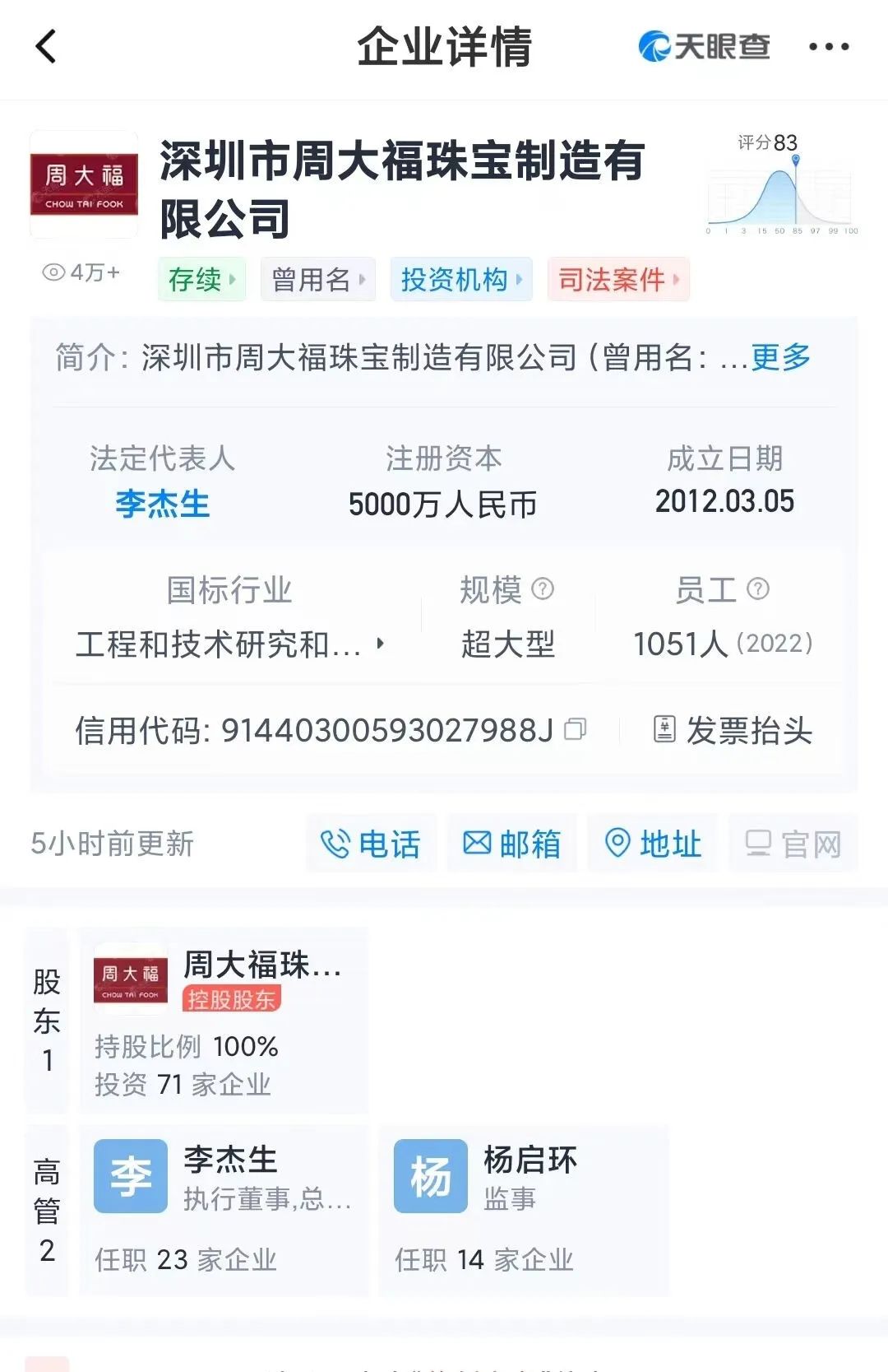 天眼查显示,深圳市周大福珠宝制造有限公司成立于2012年3月,由周大福珠宝金行(深圳)有限公司100%持股,法定代表人为李杰生,注册资本5000万人民币。据年报信息显示,该公司2022年参保人数达1051人。