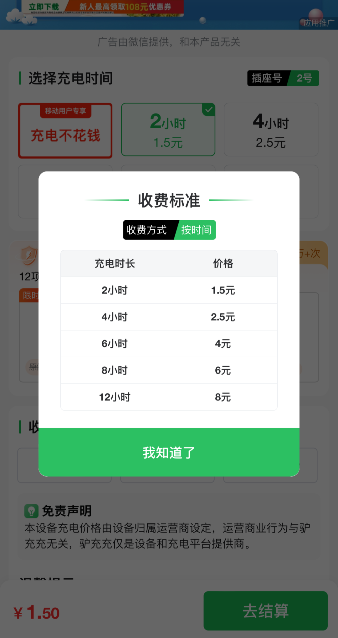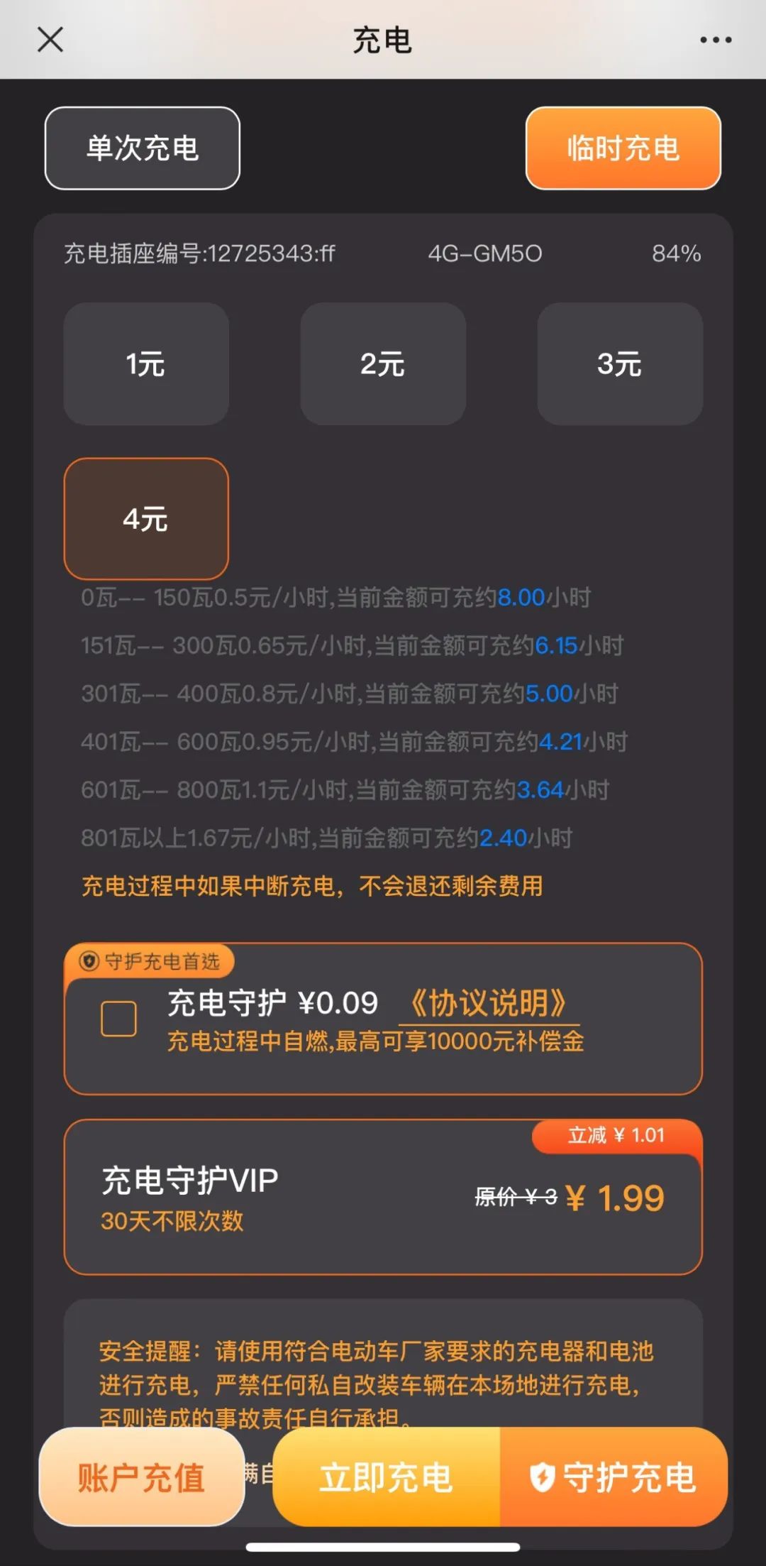“驴充充”充电桩在广州市天河区腰岗小区的收费标准