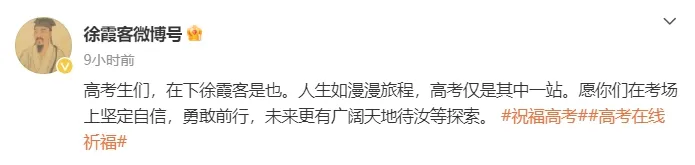 @徐霞客微博号:高考生们,在下徐霞客是也。人生如漫漫旅程,高考仅是其中一站。愿你们在考场上坚定自信,勇敢前行,未来更有广阔天地待汝等探索。