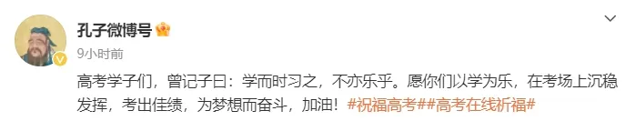 @孔子微博号:高考学子们,曾记子曰:学而时习之,不亦乐乎。愿你们以学为乐,在考场上沉稳发挥,考出佳绩,为梦想而奋斗,加油!