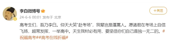 @李白微博号:高考生们,吾乃李白。仰天大笑“赴考场”,我辈岂是蓬蒿人。愿诸君在考场上自信飞扬,超常发挥,一举高中。天生我材必有用,要坚信你们自己是独一无二的。