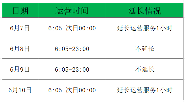 6月7日、6月10日,有轨电车延长运营服务时间1小时,即运营时间为6:05--次日00:00,其余日期运营时间维持不变。