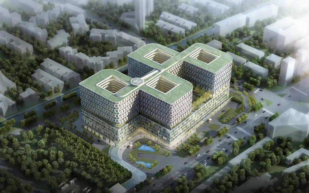 该院项目总投资26.8亿元,地上共16层,地下设3层停车场,停车位与病床数按1∶1配置。地上四座塔楼建筑,一高一低由一根轴线“背靠背”连接在一起。项目设计抛弃了传统的医疗裙房加高层塔楼病房的布局模式,将塔楼功能均匀分配在裙楼之上,在国内首创既独立又连接的院落式病房布局。