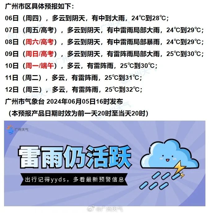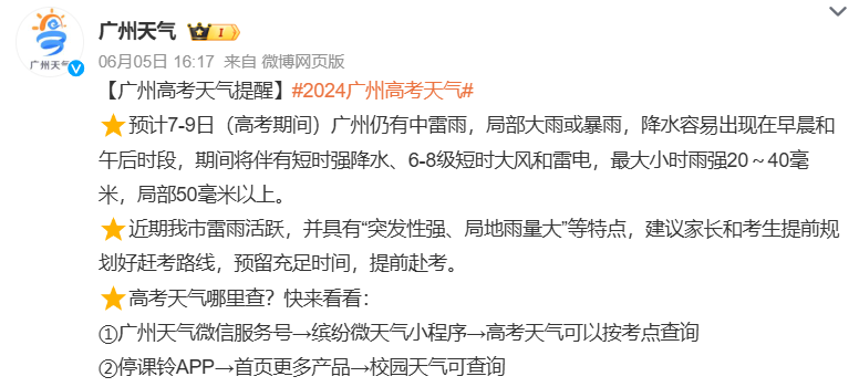 预计7-9日(高考期间)广州仍有中雷雨,局部大雨或暴雨,降水容易出现在早晨和午后时段,期间将伴有短时强降水、6-8级短时大风和雷电,最大小时雨强20~40毫米,局部50毫米以上。