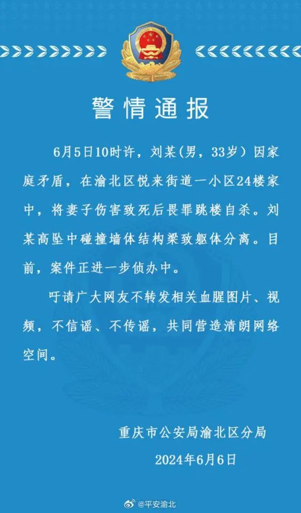 据重庆市公安局渝北区分局通报,6月5日10时许,刘某(男,33岁)因家庭矛盾,在渝北区悦来街道一小区24楼家中,将妻子伤害致死后畏罪跳楼自杀。刘某高坠中碰撞墙体结构梁致躯体分离。目前,案件正进一步侦办中。