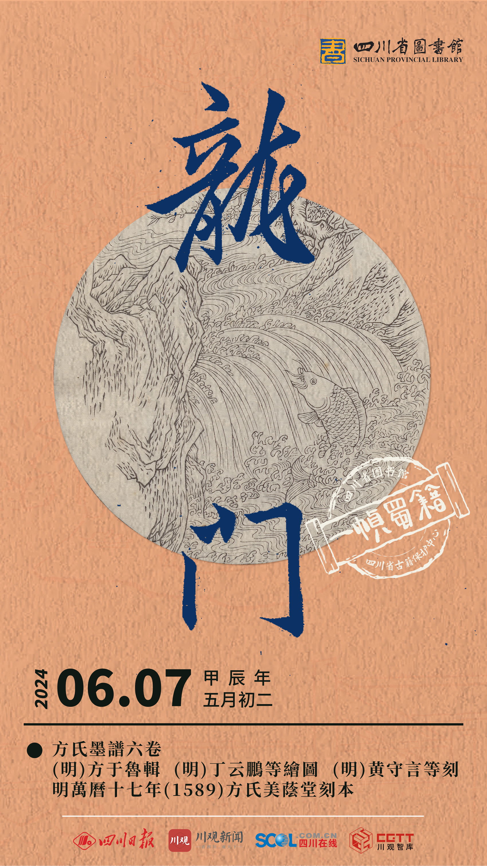 鱼跃龙门又称 "鲤鱼跳龙门 ",指黄河鲤鱼跳过龙门,就会变化成龙。这一传说后来又被赋予新的寓意,指莘莘学子经过拼搏努力,考上了自己理想的大学。6月7日,高考第一天,一帧蜀籍祝福广大学子都能金榜题名,取得满意成绩。海报所用版本为方氏墨谱六卷 (明)丁云鹏等绘图 (明)黄守言等刻 明万历十七年(1589)方式美荫堂刻本。