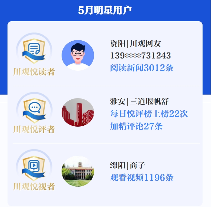 于是,冯同学每天就开始浏览川观新闻,遇到感兴趣的话题就去评论。“如果当天我的没上榜,我就去学习其他上榜网友的评论,去get那个‘点’!”经过不停地“打磨”,冯同学的评论上榜次数越来越多。“这盘还当选了‘川观悦评者’,感觉不错,我会继续努力!”