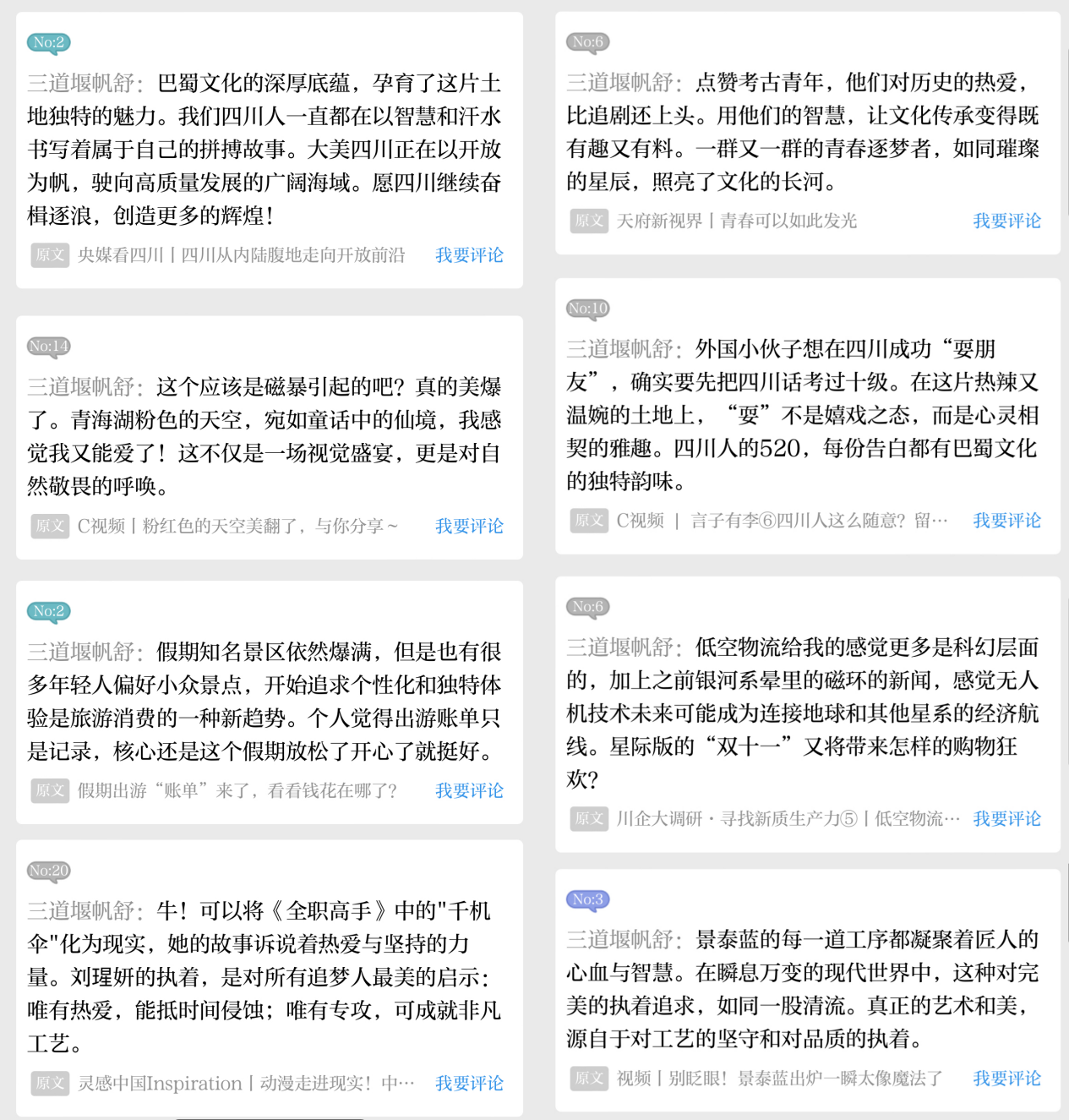 川观网友“三道堰帆舒”是来自雅安的冯同学,她是一名在校大学生。今年2月,她发现川观新闻推出了“每日悦评榜”,优质评论就有机会上榜。“这个榜单瞬间就激发了我的胜负欲,我也想要上榜。”