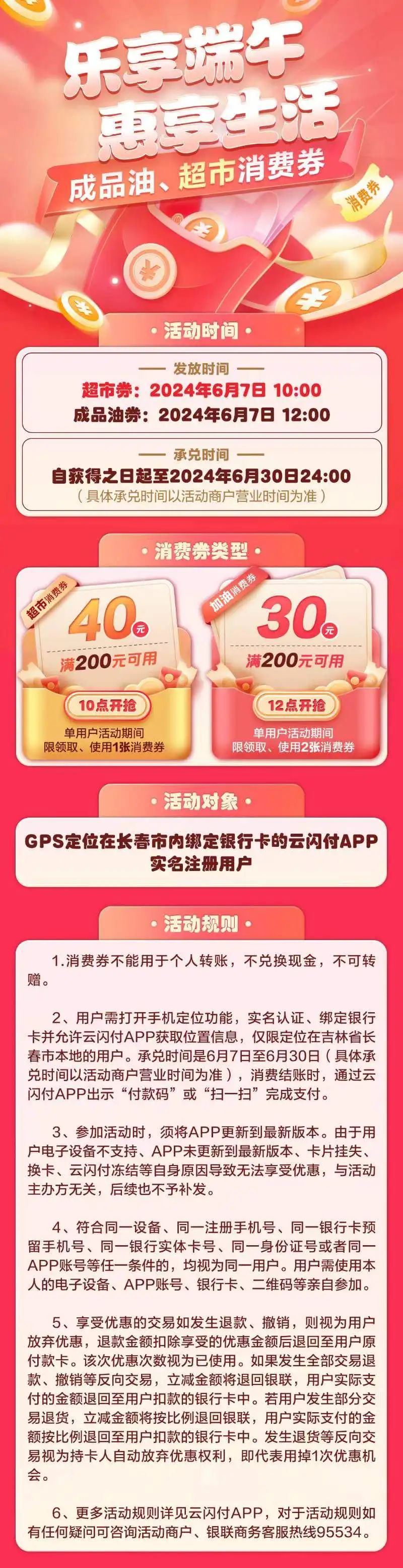 为激发端午节庆消费潜力,点燃夏季消费市场活力,长春市商务局拟于2024年6月7日启动新一轮商业消费券发放活动,包含超市消费券、成品油消费券两个品类。现公告如下。