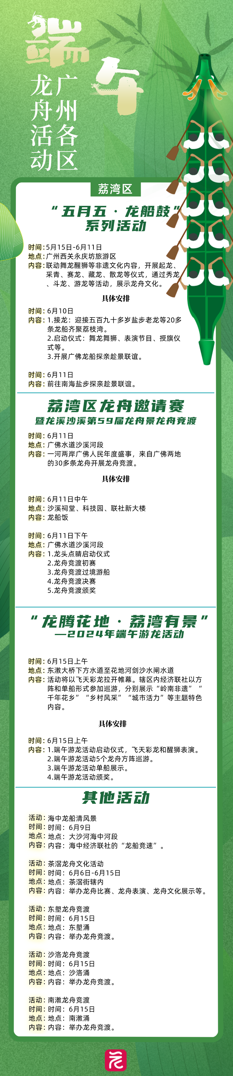 系列活动通过龙舟漂移表演、招景探亲、龙舟竞渡、古法沐兰、非遗文汇、艺术长龙、汉风墟市等一系列龙舟非遗民俗文化活动为市民游客带来一场有趣好玩、粤韵悠长的端午民俗之旅。
