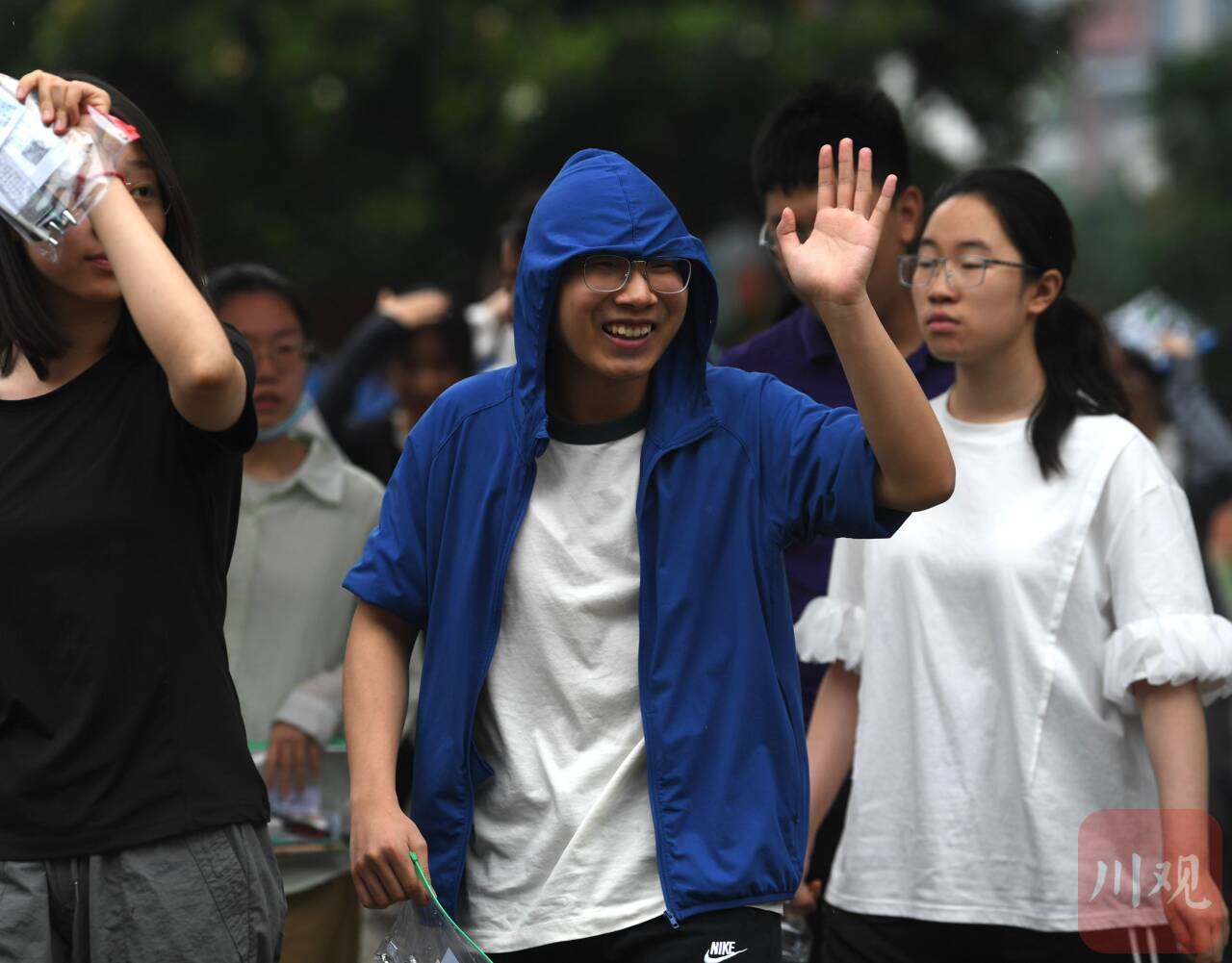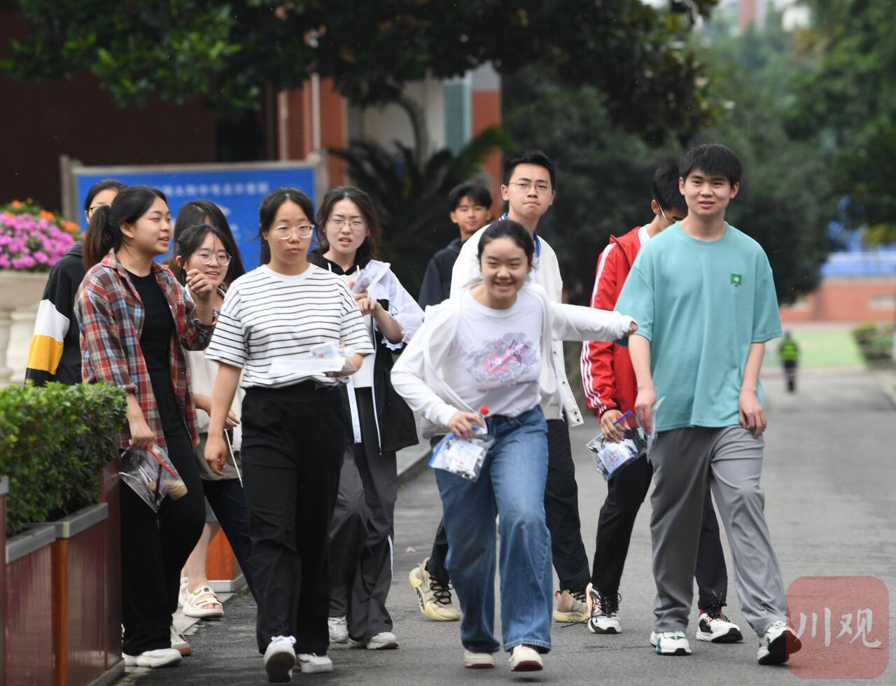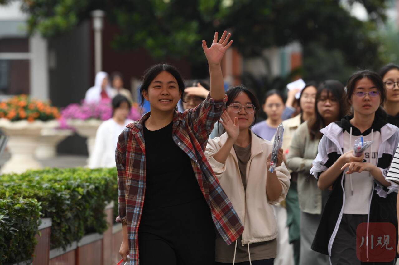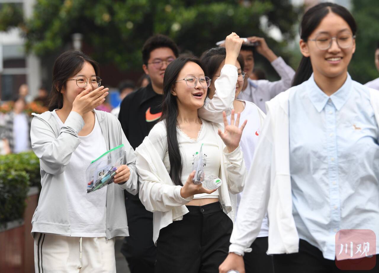 6月7日上午,伴随着高考第一科语文考试结束铃声响起,四川师大附中考点的考生面带笑容,走出考场。