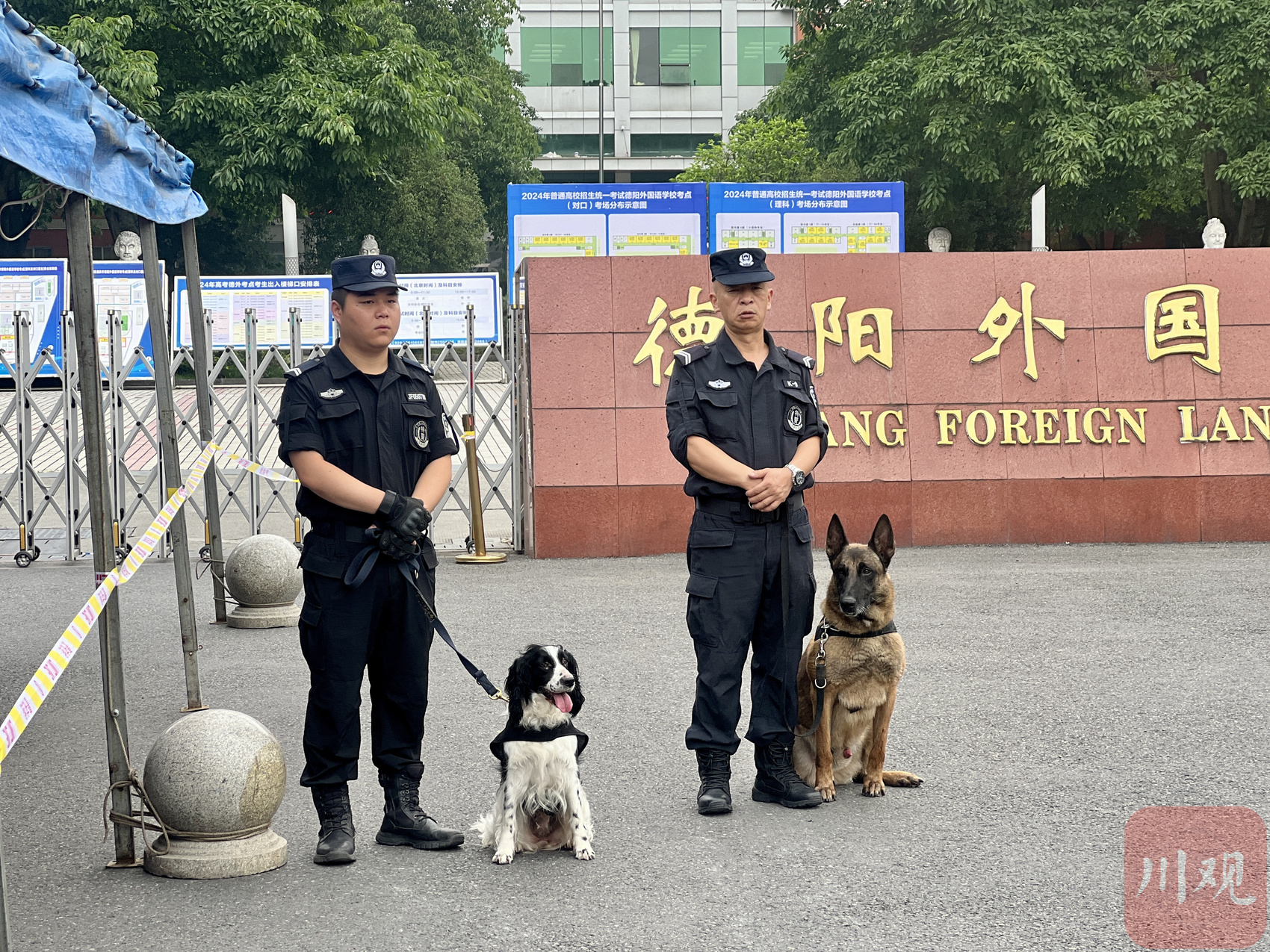 6月7日,2024年高考拉开了序幕,德阳外国语学校考点外,交警开道,特警巡逻,德阳公安各司其职全力护航高考。其中,还有一支特殊“部队”也在守护着德阳考生的安全。