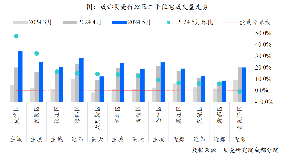 4月29日起,成都在全市范围内取消限购政策,购房者不再受到诸多限制,可以根据自己的需求和意愿购房。这一政策实行后,成都主城区二手房成交量在5月止跌回升,据贝壳研究院成都分院统计,5月,成都主城区二手房成交环比提升3个百分点。