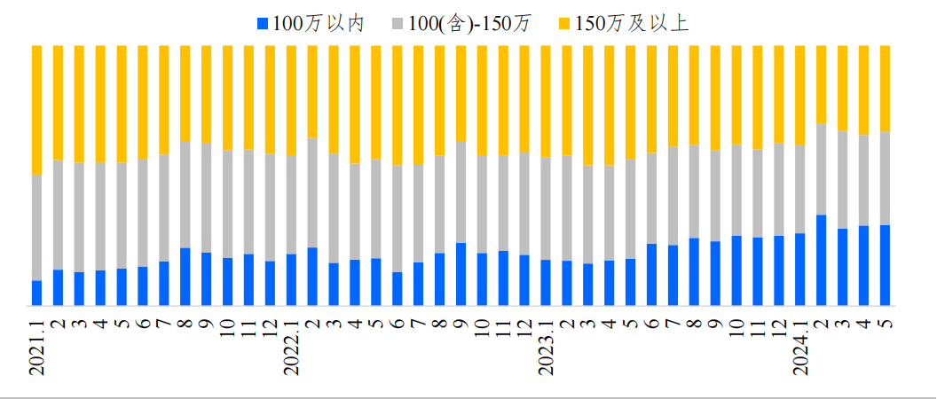 从市场表现来看,二手房市场的刚性需求仍然很强劲,极刚客群购房占比持续走高,中间层小幅接力。5月,100万元以内的成交占比仍呈上行趋势,100(含)-150 万元中间层成交占比小幅增加,处于近一年较高水平,呈现弱复苏状态。