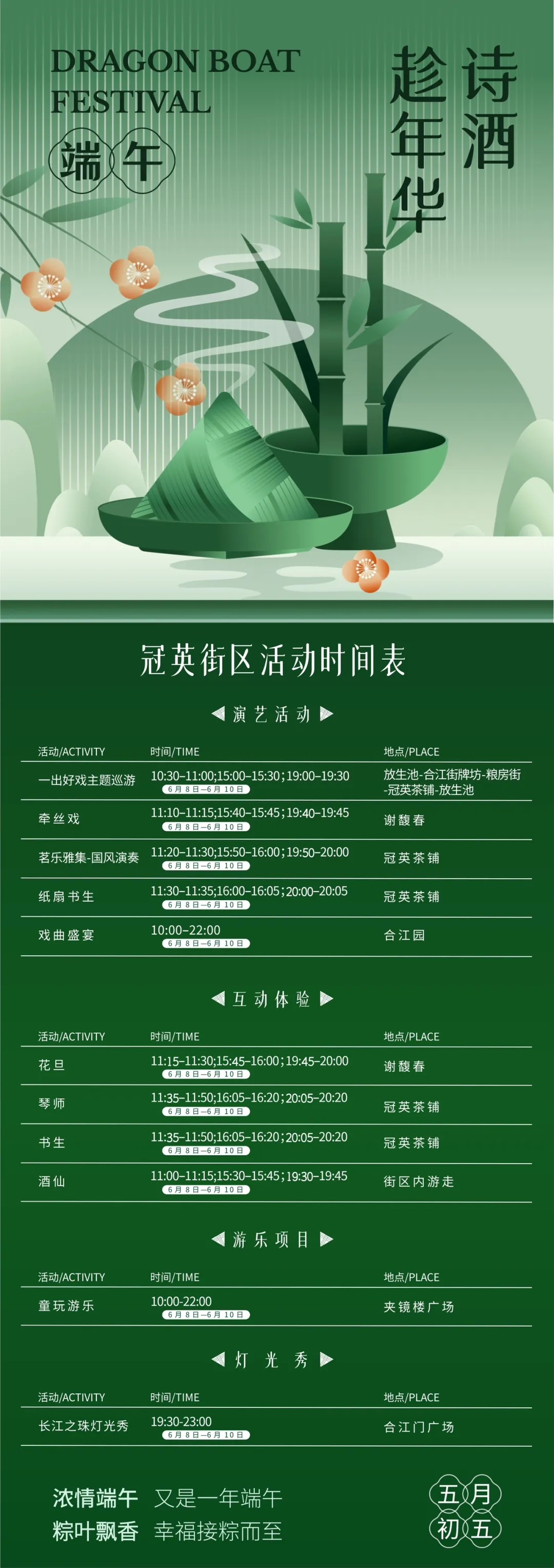 “潮玩翠屏·诗酒趁年华”活动,现场开展演艺活动、国潮巡游、互动等活动。李庄镇如意原乡开展“青山绿水粽飘香 文化遗产共传承”活动,现场开展包粽子、竹编、抓鱼体验活动和非遗展示学习活动。