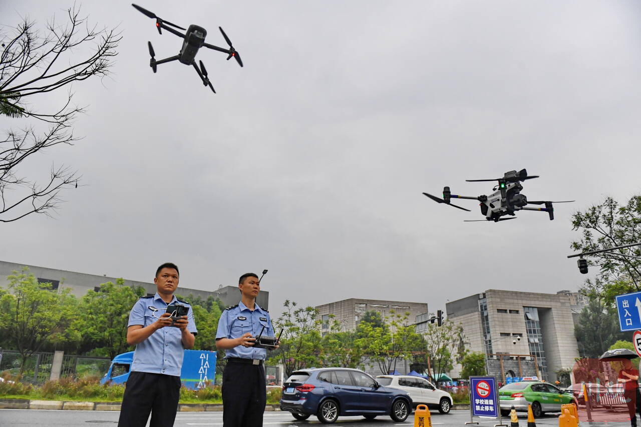 在成都石室天府中学考点,成都交警六分局与成都高新公安首次采用空地联动方式护航本届高考考生。成都交警六分局的警用摩托车和警车,在地面为考生乘坐的大巴车开道,护送考生抵达成都石室天府中学考点。空中,来自成都高新公安的警用无人机,一边进行线路巡逻,一边对社会车辆“喊话”,文明劝导。考生安全抵达考点后,无人机下降高度对在外等候的家长也进行了文明候考、考试期间勿大声喧哗的高空“喊话”。