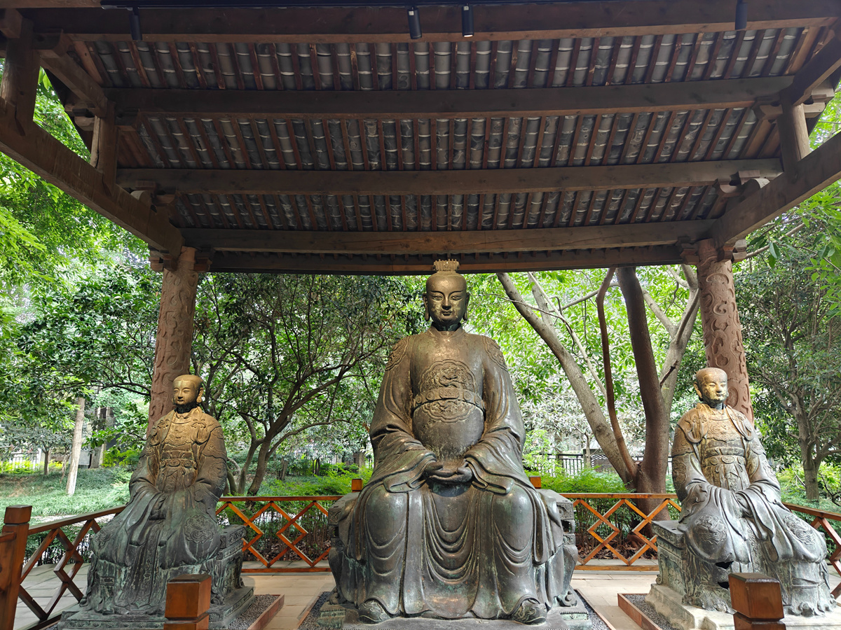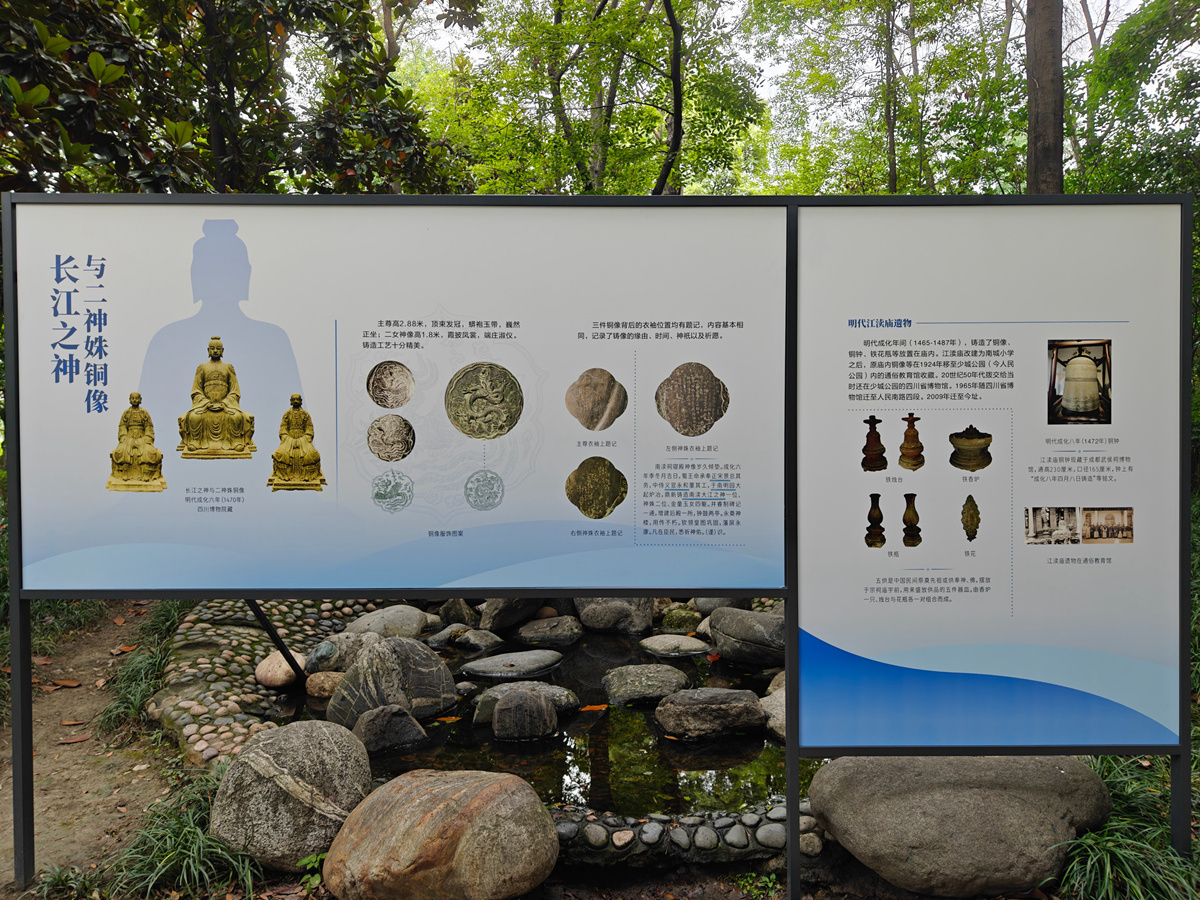 值得一提的是,当年江渎庙供奉的三件铜像,如今均完整保存于四川博物院北门广场东侧的廊亭里。主尊长江之神高2.88米,顶束发冠,蟒袍玉带,两侧二女神像高1.8米,霞帔凤裳,端庄淑仪,铸造工艺十分精美。三件铜像背后的衣袖位置刻有题记,记述因之前的神像已倾斜下陷,于是在明成化六年(1470年)冬季最后一个月的一个吉日,蜀王命人铸造了这三尊神像,其中包括长江之神、两位女神和四位金童玉女。铸像的同时,还刻有一通碑记,增建一所后殿和钟亭、鼓亭。
