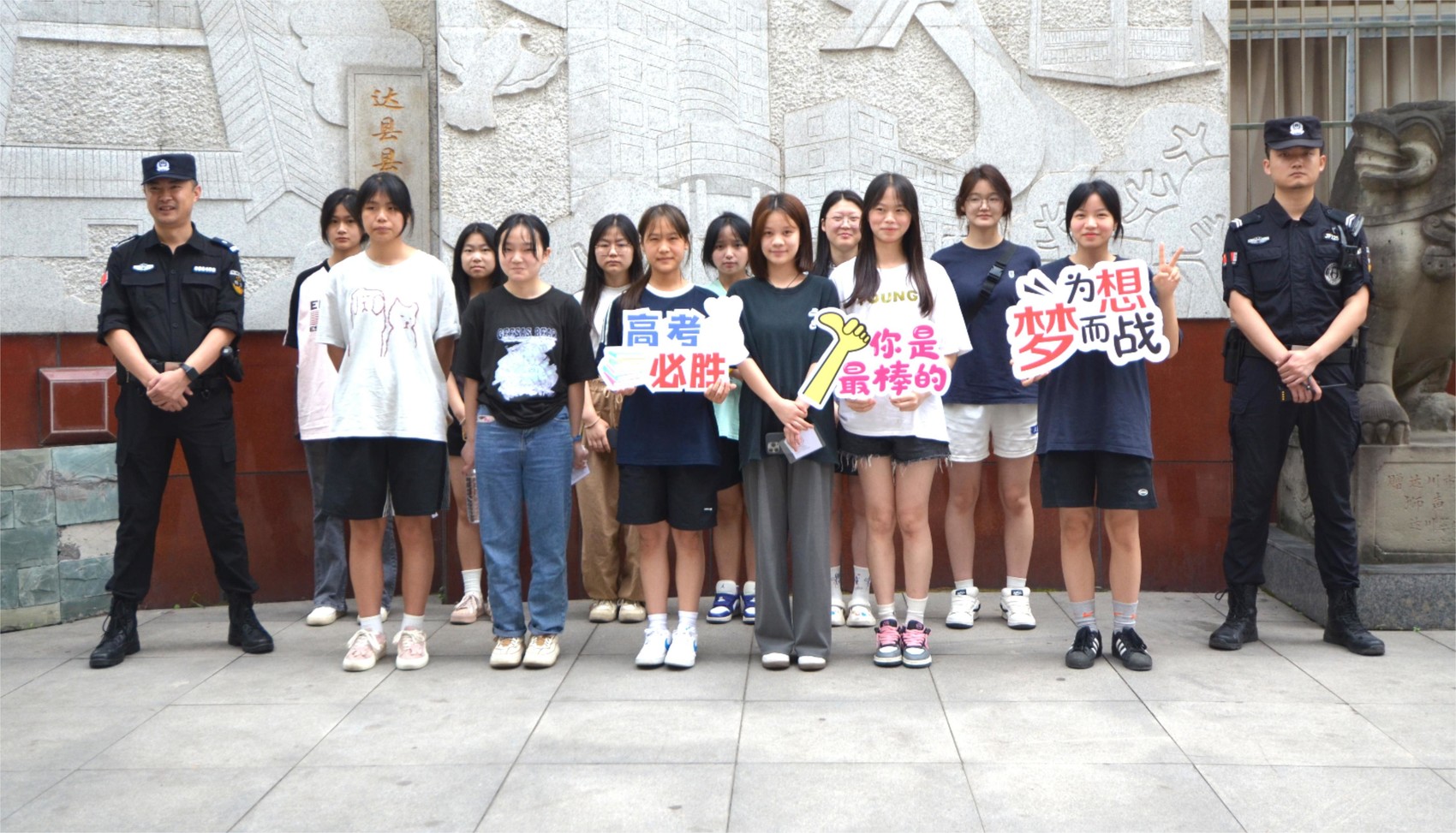 7点30分,达州市职业高级中学组织学校爱心车队护送该校10名住校学生从学校出发前往达州市第一中学凤凰校区考点。到达考点后,现场执勤的特巡警和城市管理综合执法人员为这10名参考学生送上“高考必胜”“为梦想而战”等祝福。