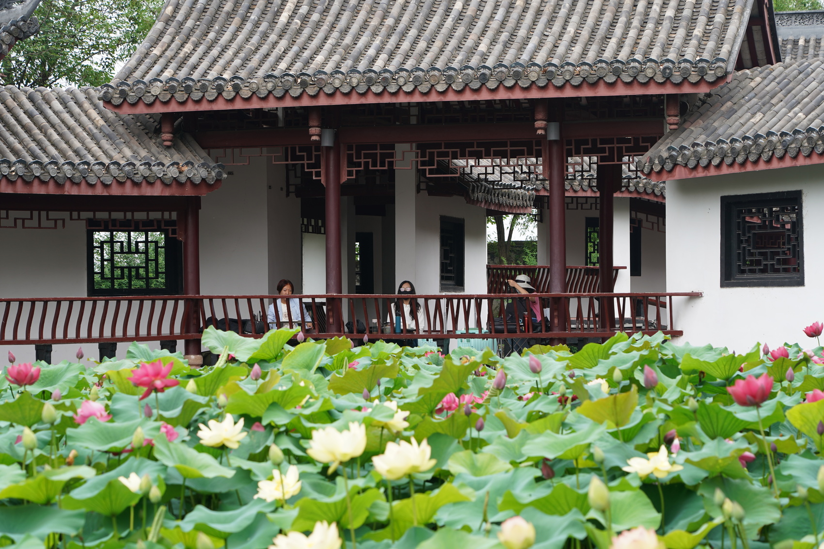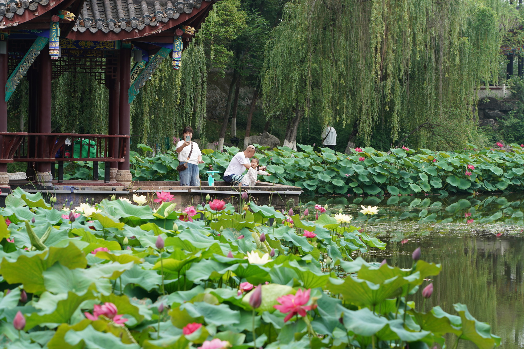 在葱绿的莲叶丛中,一枝枝荷花亭亭玉立,像娇羞的少女,或满脸绯红,或洁白纯净。公园内,不少市民朋友纷纷拍照打卡,还有美术爱好者在此写生创作,记录下这炎炎夏日中的美丽风光。