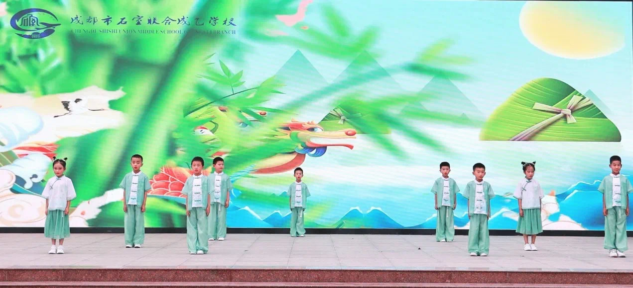 “五月五,过端午……”在成都市石室联合成飞学校,一年级(5)班的同学们为全校师生带来主题为“端午粽情浓 传统记心中”的国旗下展示活动,现场诗朗诵、舞蹈表演令人应接不暇。在老师的指导下,孩子们生动再现了端午节的历史记忆。
