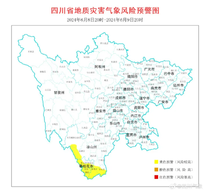 值得注意的是,今日下午,四川气象发布地灾预警:6月8日20时-6月9日20时,攀枝花大部、凉山州西南部发生地质灾害的风险较高。请上述地区加强地质灾害防范工作。