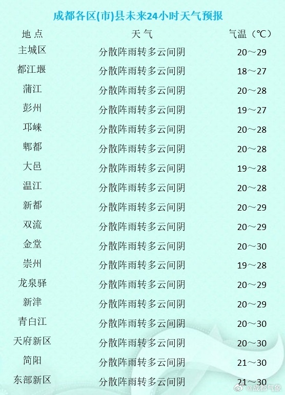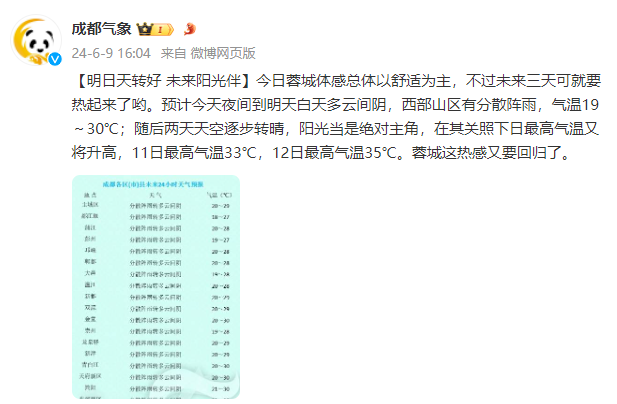 据成都气象,今日成都体感总体以舒适为主,不过未来三天可就要热起来了哟。预计今天夜间到明天白天多云间阴,西部山区有分散阵雨,气温19~30℃;随后两天天空逐步转晴,阳光当是绝对主角,在其关照下日最高气温又将升高,11日最高气温33℃,12日最高气温35℃。