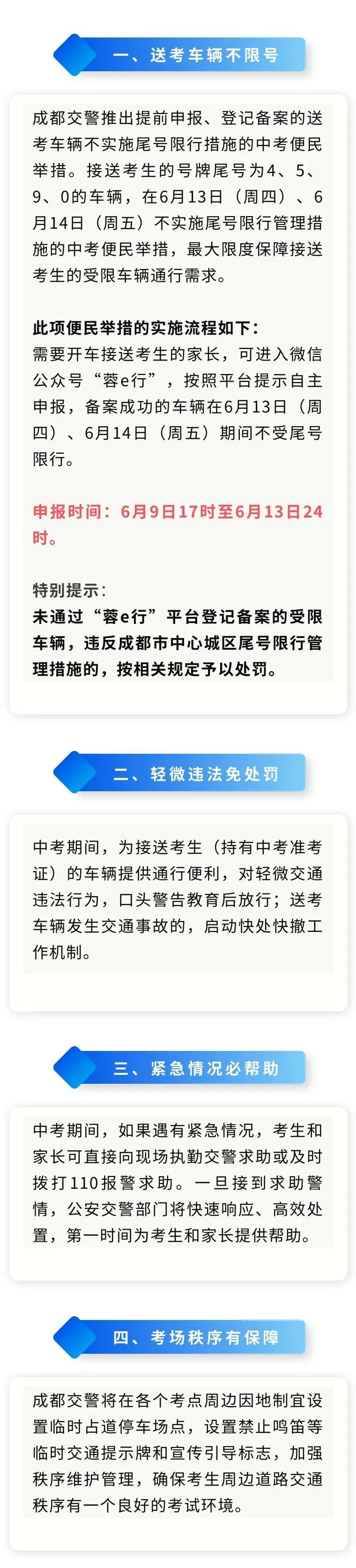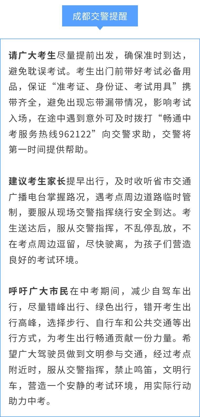 成都交警为保障中考期间城市道路的安全畅通,将启动“畅通中考服务热线”962122,该热线电话设在市公安局交管局智能交通指挥中心,由值班人员全时值守,对考生及中考相关人员的交通求助,均予以及时接受、及时调度、及时指挥、及时帮助。