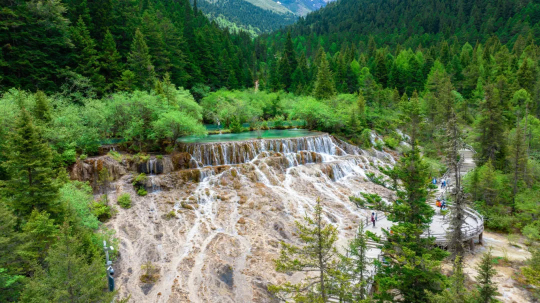 黄龙景区飞瀑流辉引游人拍照留念 黄龙景区管理局供图