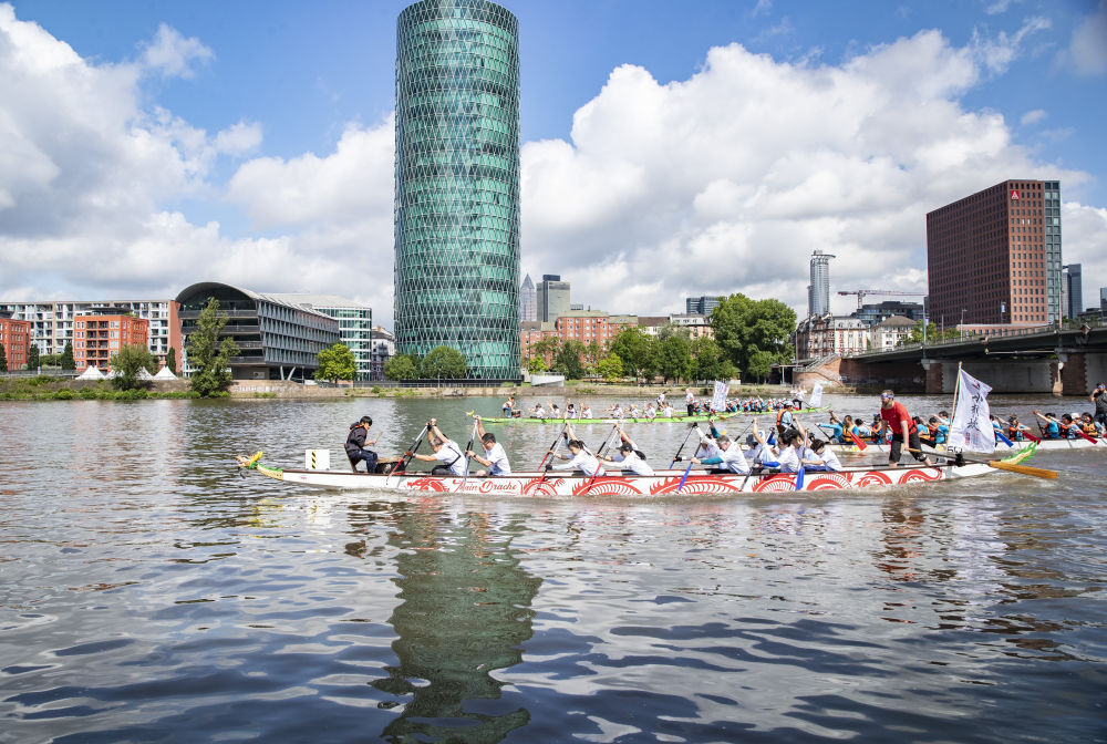 5月25日,在德国法兰克福,龙舟队伍在美因河上参加比赛。第一届法兰克福国际龙舟友谊赛暨2024年法兰克福中国节开幕式当日举行,来自中国、德国、意大利等国的龙舟队同台竞技,现场丰富多彩的中国文化展演活动吸引大批观众参与。新华社记者 张帆 摄