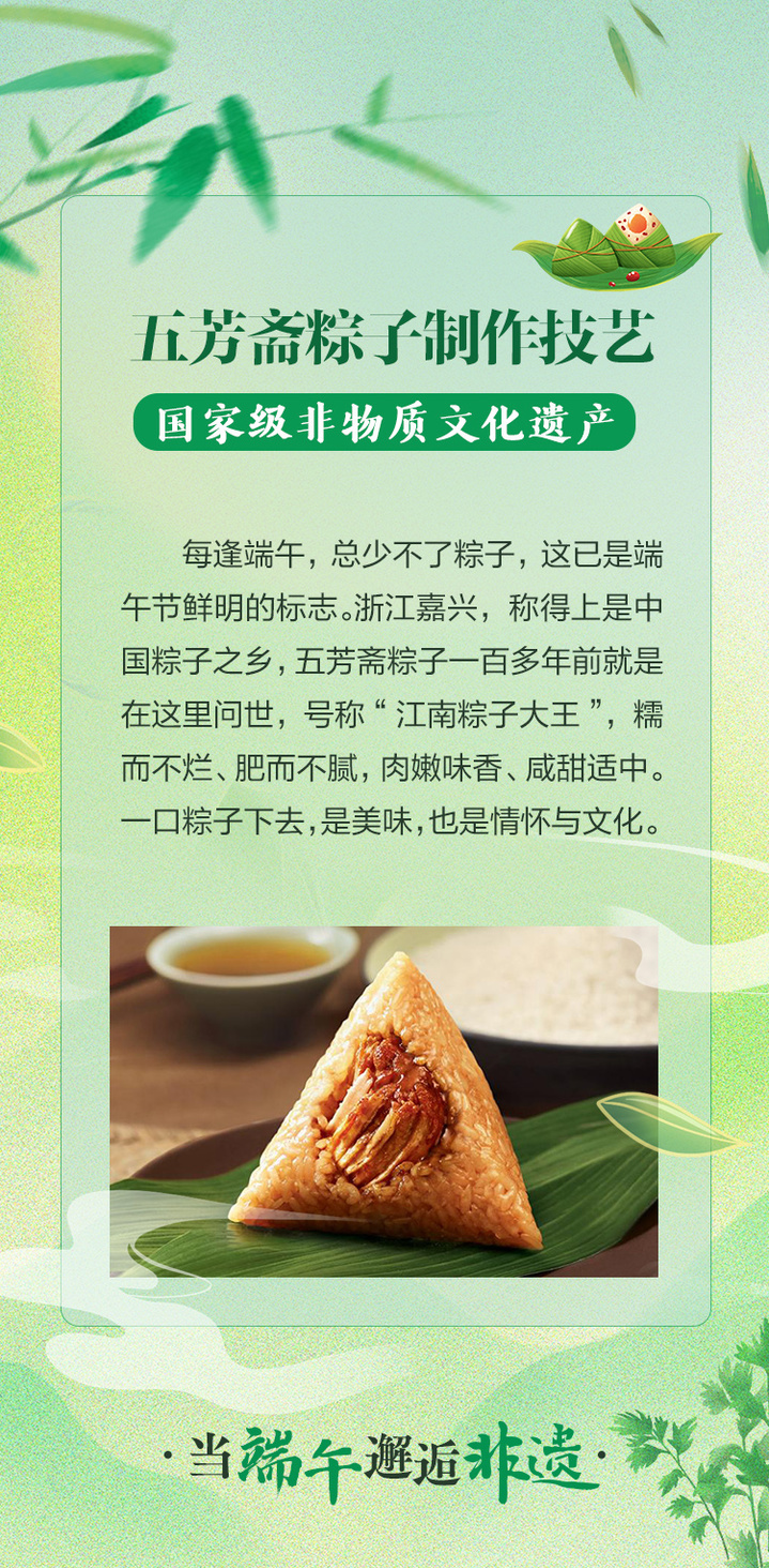 同屈原投江有着紧密联系的包粽子、吃粽子也早已是端午节的标志之一。各地的粽子制作方法不尽相同,富有当地特色。恩平裹粽制作技艺、扶绥壮族火龙粽制作技艺、道源湖村粽子制作技艺......如今,许多不同的代代相传的粽子制作技艺已成为非遗被保护、传承,五芳斋粽子制作技艺就是一个著名的代表。