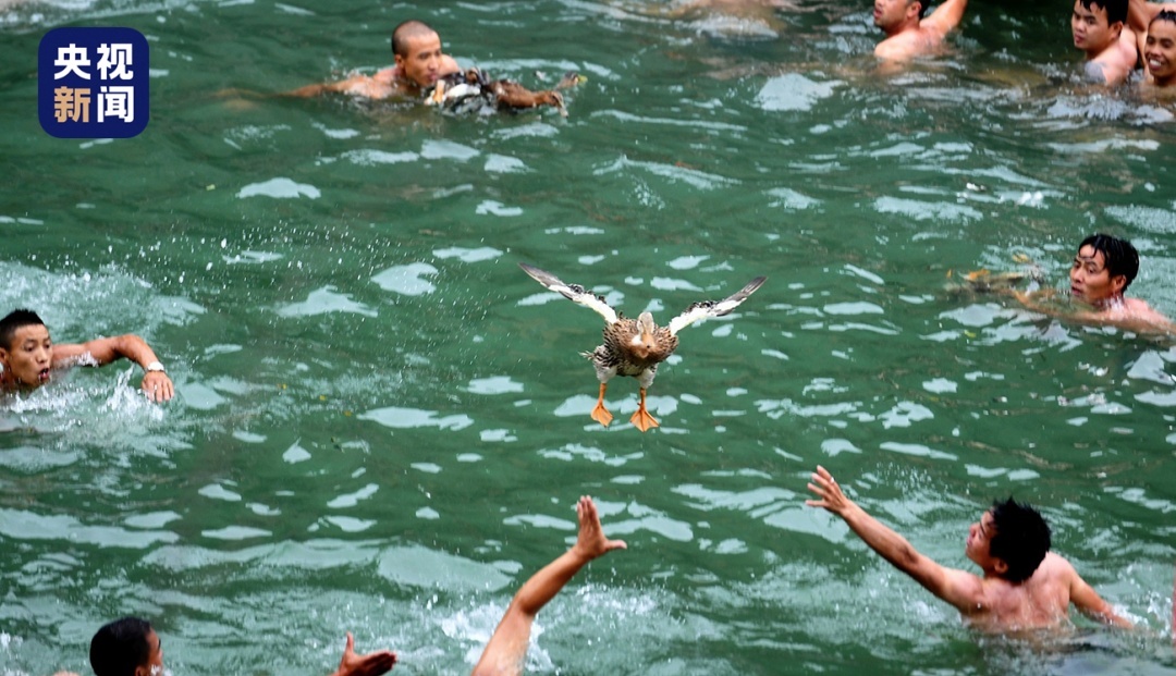 每年端午节,现场的工作人员会把上百只鸭子从河边的吊脚楼上抛进水中,在岸边、水中等候的人们纷纷一头扎进水中,谁能抢到,鸭子就归谁,就是这么“简单粗暴”。今年的抢鸭子大赛于 6月10日举行。