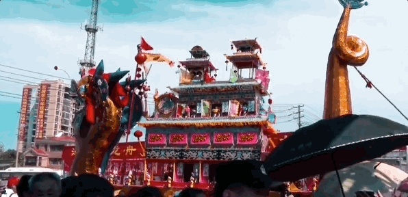 整个巡游队伍中,最有看点的是一条长7米、高4米多的旱龙舟,“金龙”口含彩球,威风凛凛。