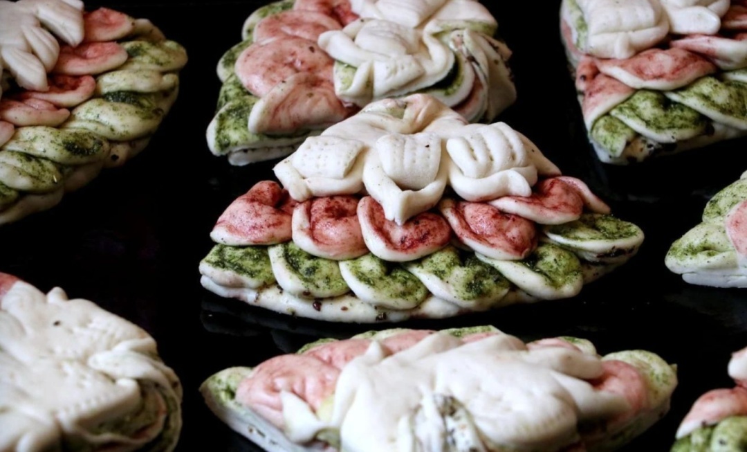 扇子馍有五层,在每一层分别撒上胡麻盐、香豆粉、红曲、姜黄,然后上面盖上一层盖皮,切成大小匀称的扇形后上锅蒸。面扇子每层一种颜色,也叫五色馍,尝上一口,那叫一个香。