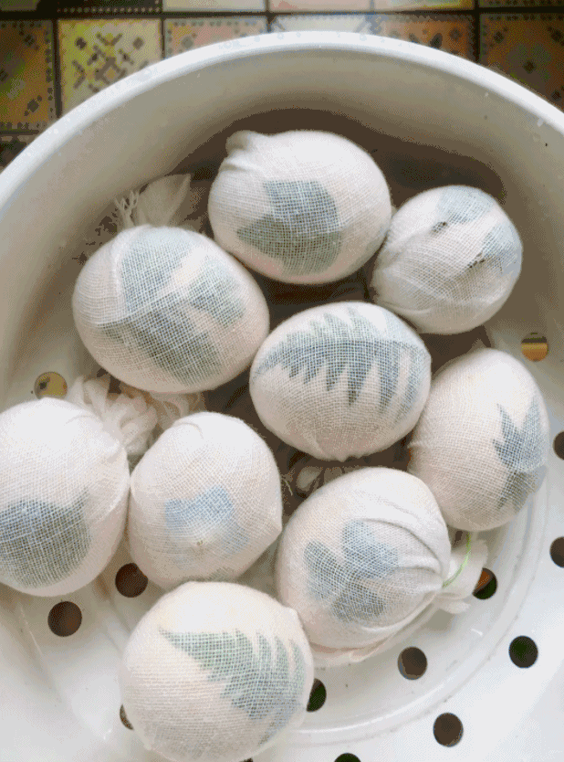 煮鸡蛋前,把形状各异的花花草草贴在鸡蛋上,用纱布固定好进行水煮,这样漂亮又好吃的印花蛋就做好了。