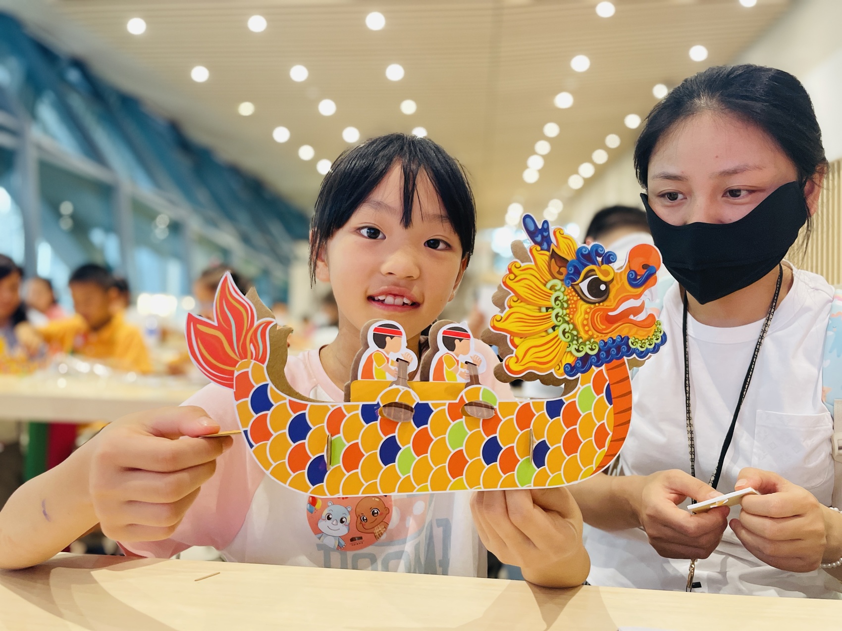 “端午小课堂”上,小朋友进行龙舟模型拼装。