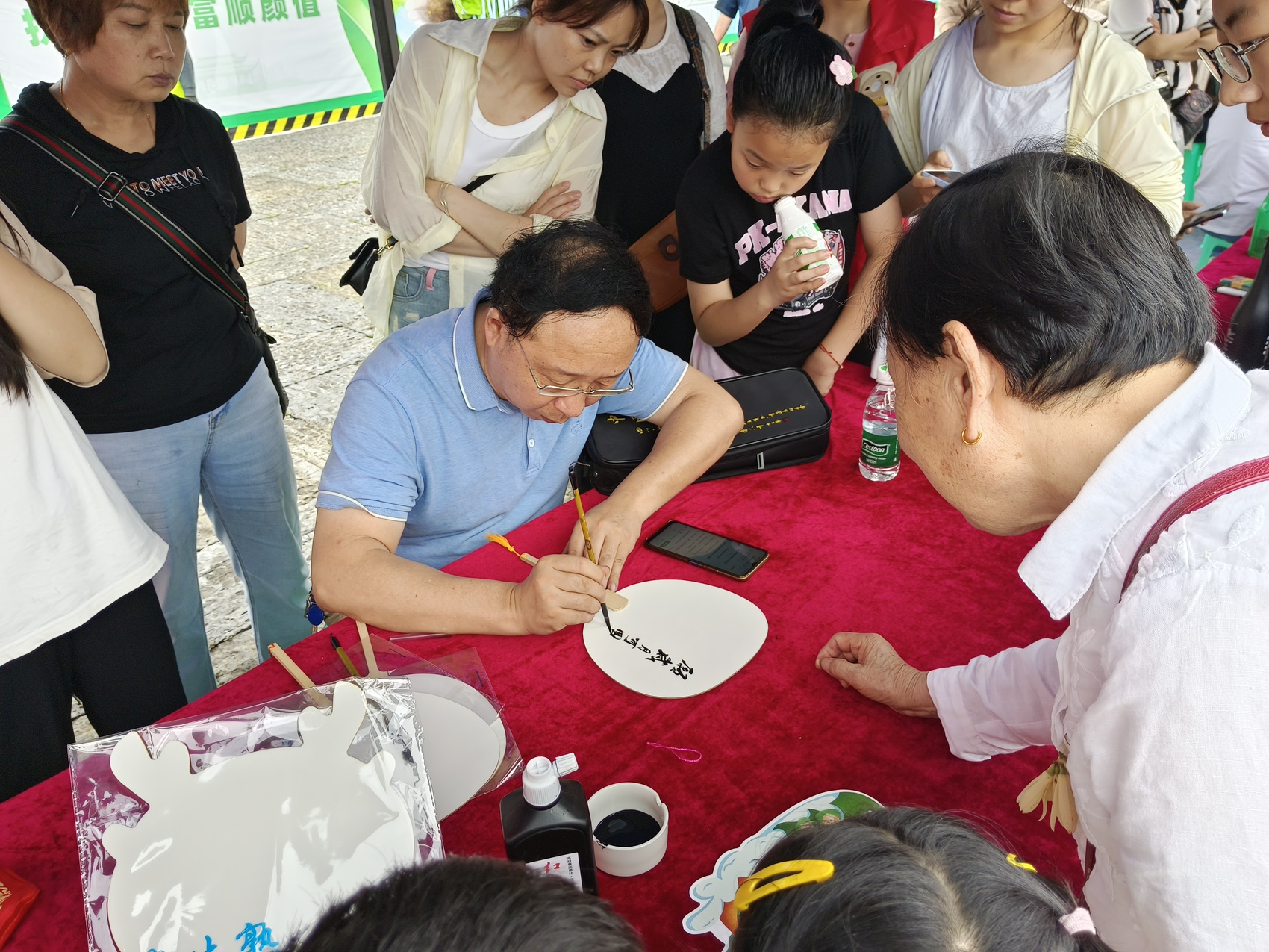“老师,我儿子刚参加完高考,帮我写个高考必粽嘛,谢谢。”在舞台的一侧,一批又一批的市民围着书法家们,请求帮忙在团扇上写吉祥话,期盼孩子能考个好成绩。