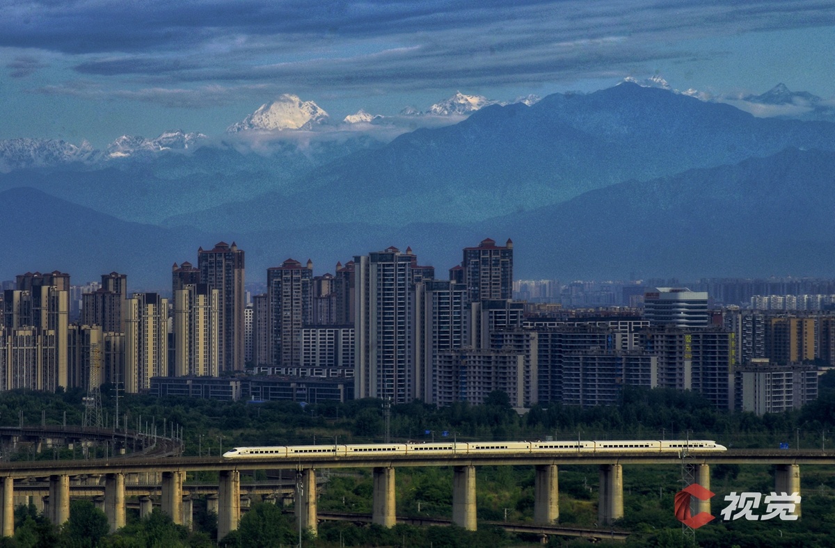 6月11日,在成华区遥望四姑娘山,雪山与晨光中的高楼、动车同框,别有一番韵味。(C视觉摄影师 曹省利 摄)