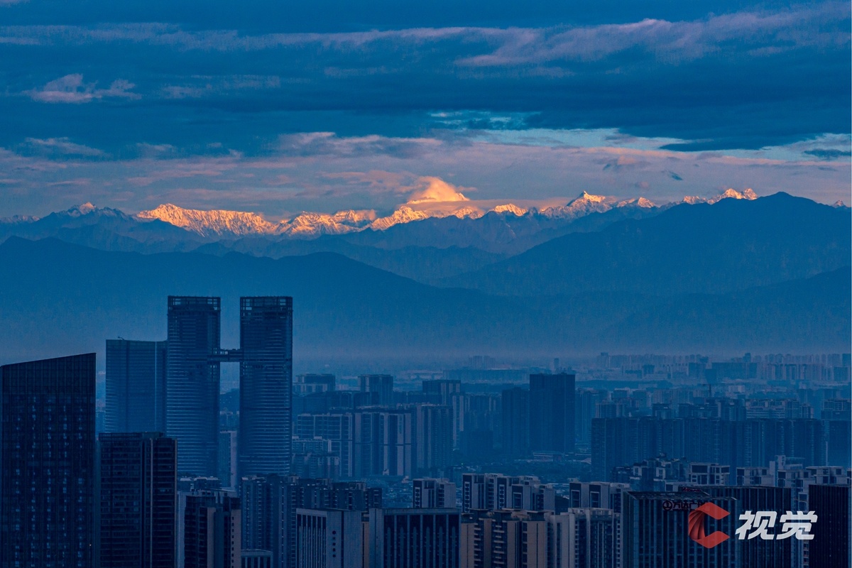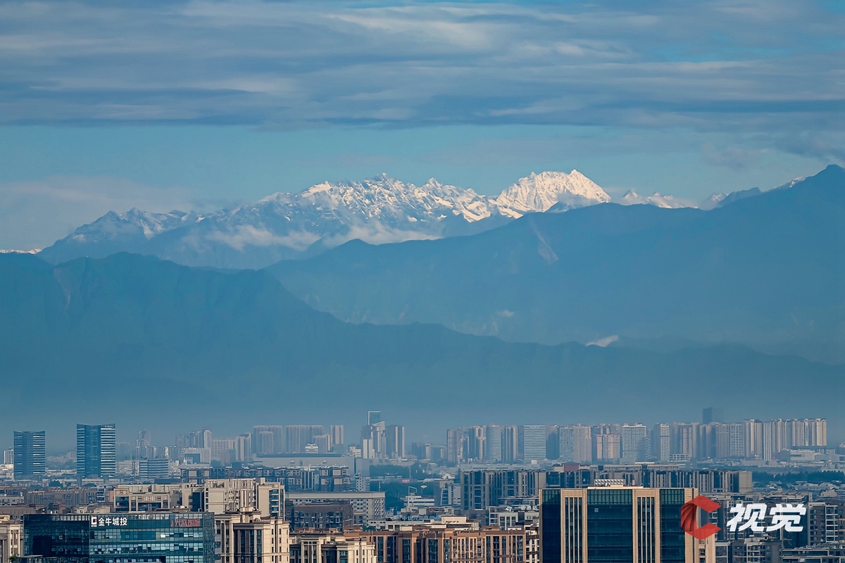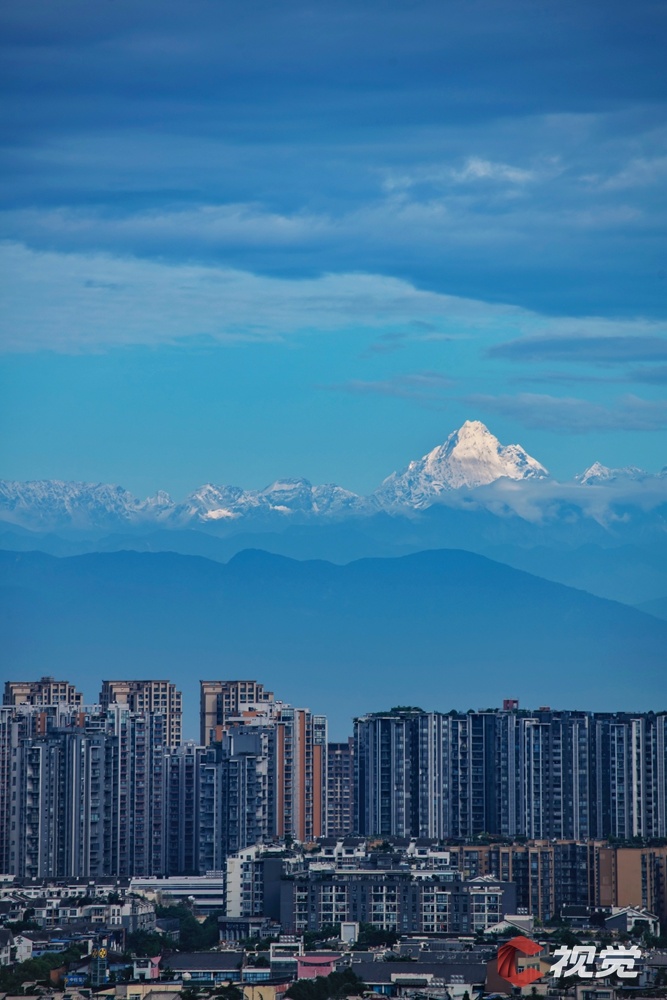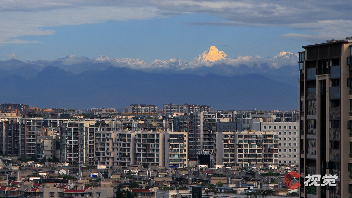 6月11早晨,在成都红牌楼遥望四姑娘山幺妹峰。(C视觉摄影师 何正)
