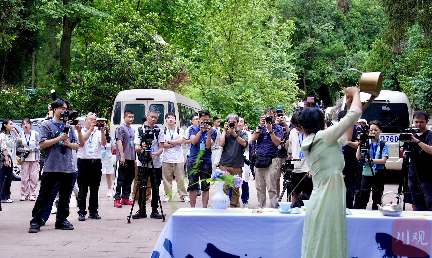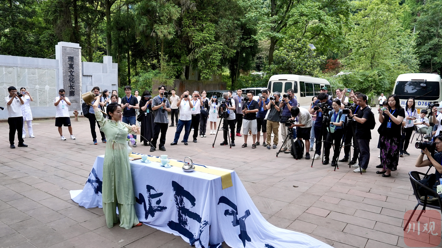 媒体记者在禹王宫理真蒙顶山茶体验中心拍摄茶艺表演