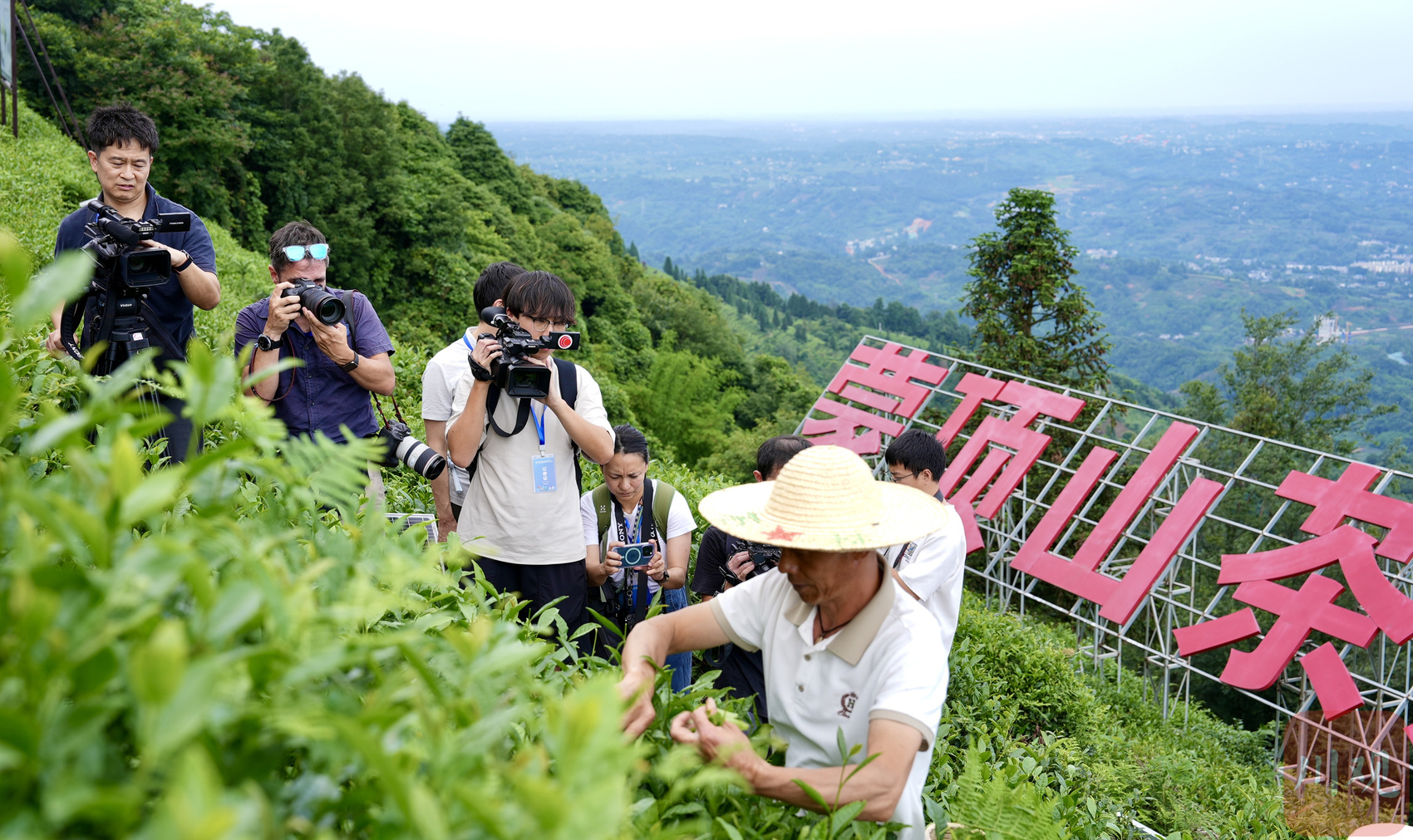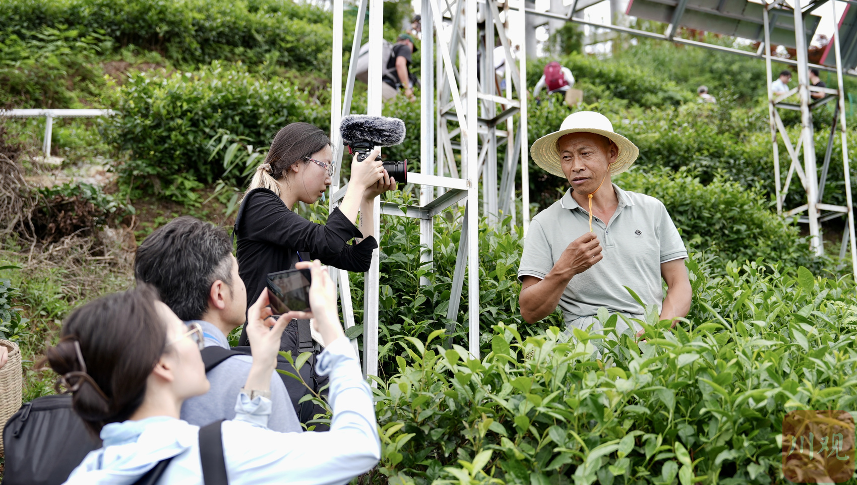 媒体记者在茶园拍摄茶农采茶