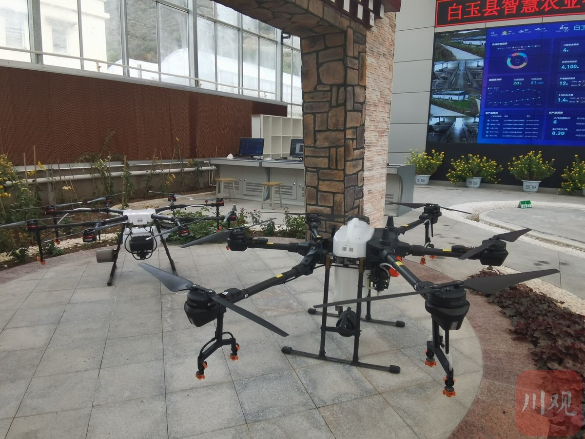 10月18日,在白玉县智慧农业物联网溯源大数据指挥平台中心,记者看到了3架无人机,进行施肥、喷药等无人操作。令李卫东自豪的是,农业部给甘孜州颁发的两张无人机“飞手证”,“都集中在我们公司”。